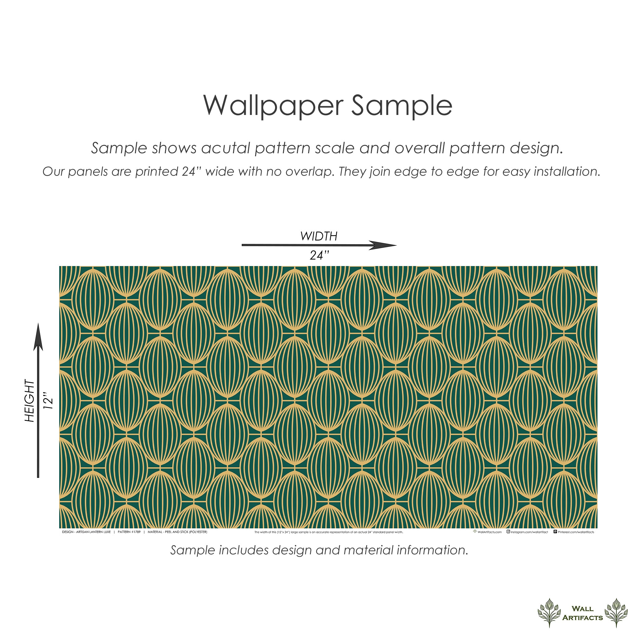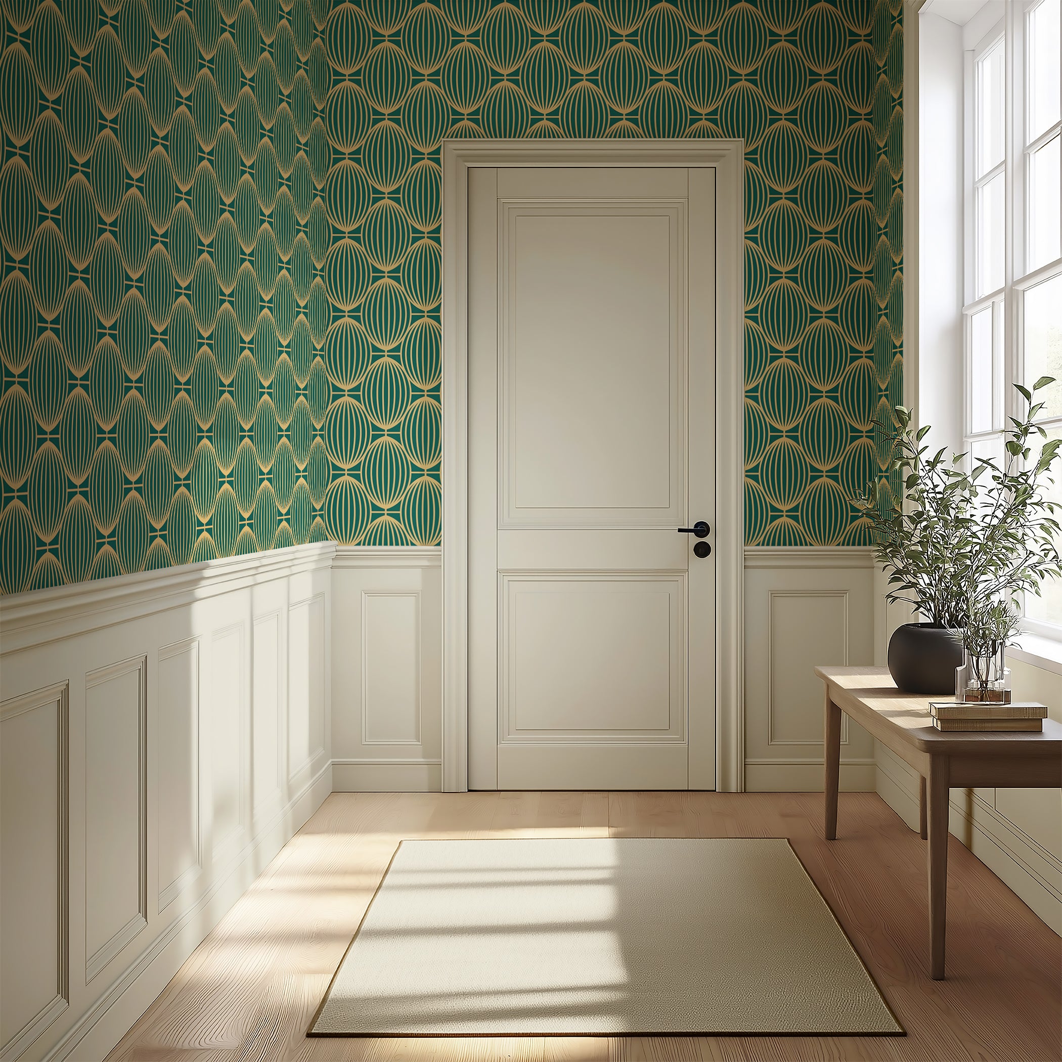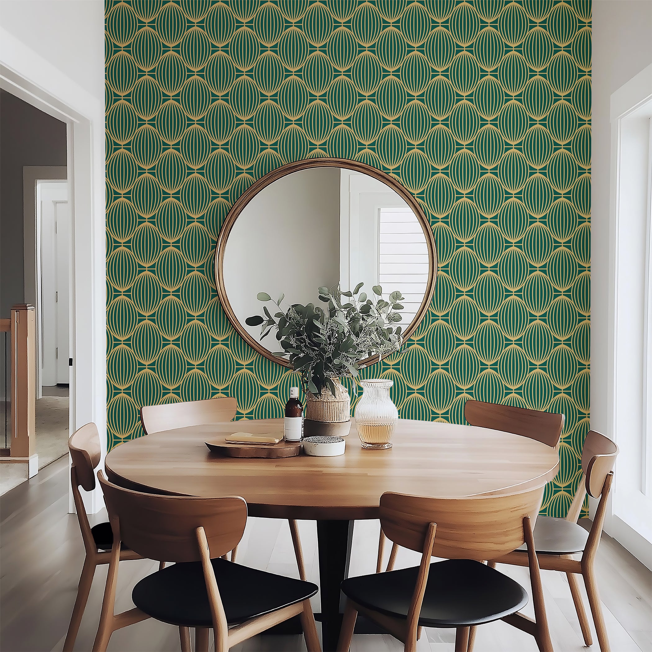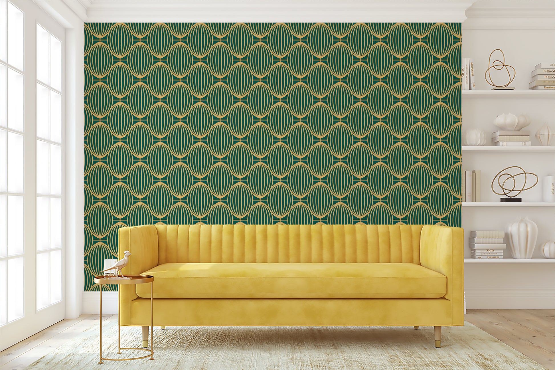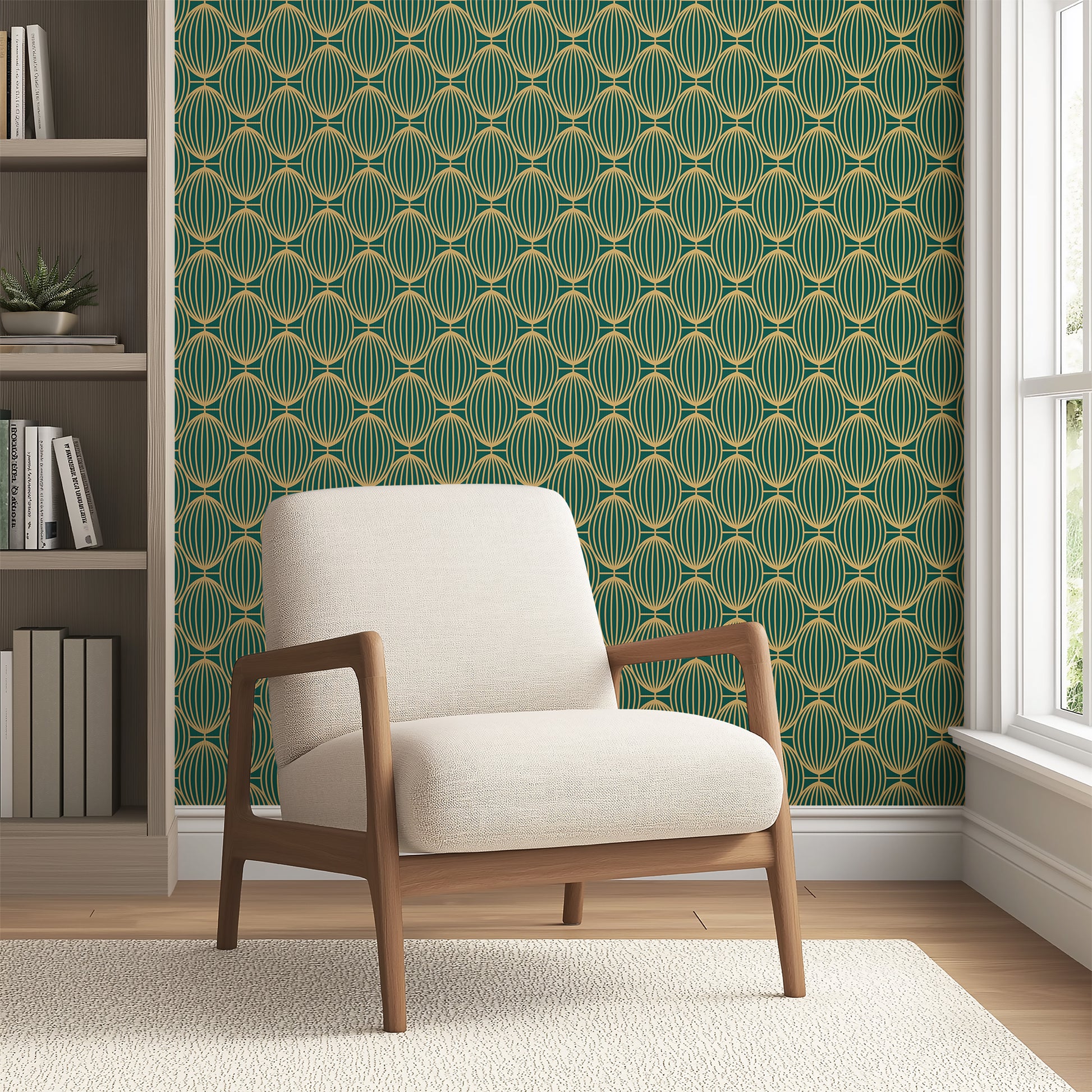 Transform your walls with "Artisan Lantern Luxe", an elegant Art Deco wallpaper that infuses architectural cadence and a luminous allure into any room. This geometric wallpaper design showcases gold lantern-inspired ovals linked in a geometric grid on a deep emerald background, achieving a symmetrical yet sophisticated look. Ideal for statement walls, formal dining rooms, or a grand entryway, it echoes the glamour of yesteryear design while seamlessly integrating with contemporary décor. The intricate lines add depth and texture without being overpowering, making it suitable for both bold and minimalist styles. Printed on durable, high-quality materials for lasting elegance and easy installation in today's design-savvy homes.