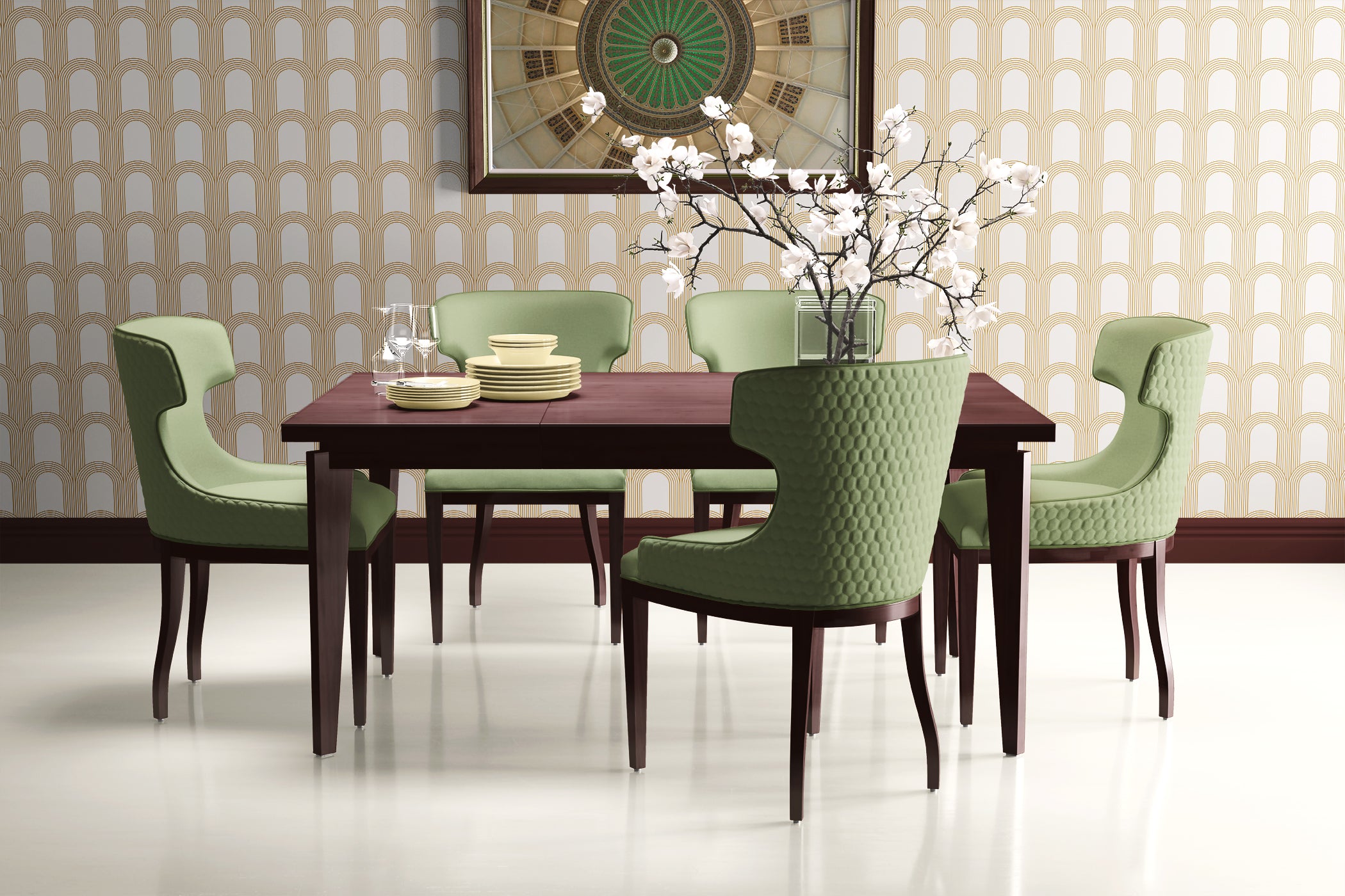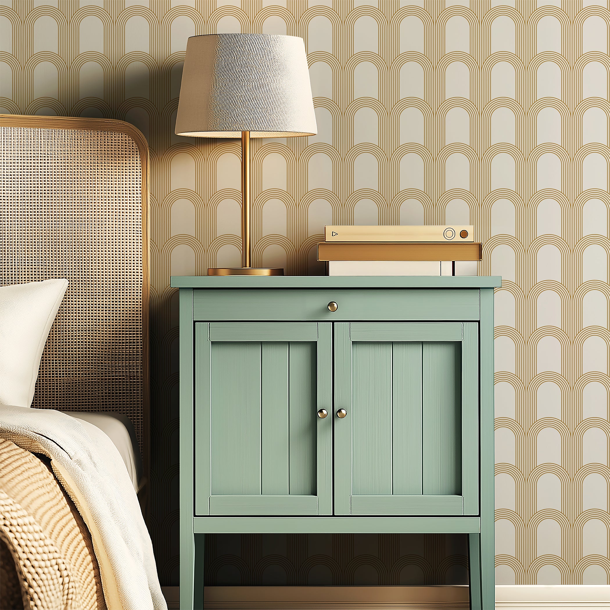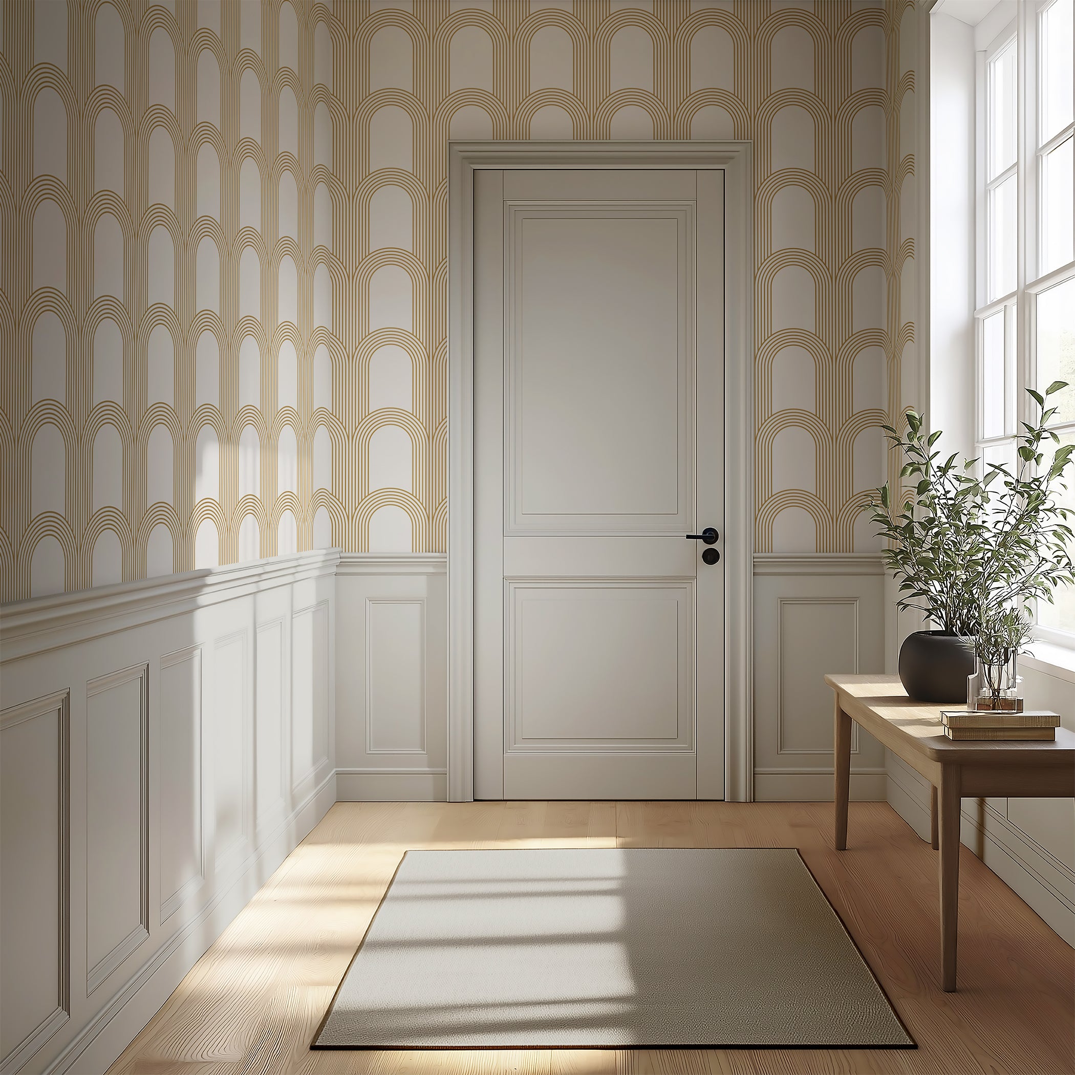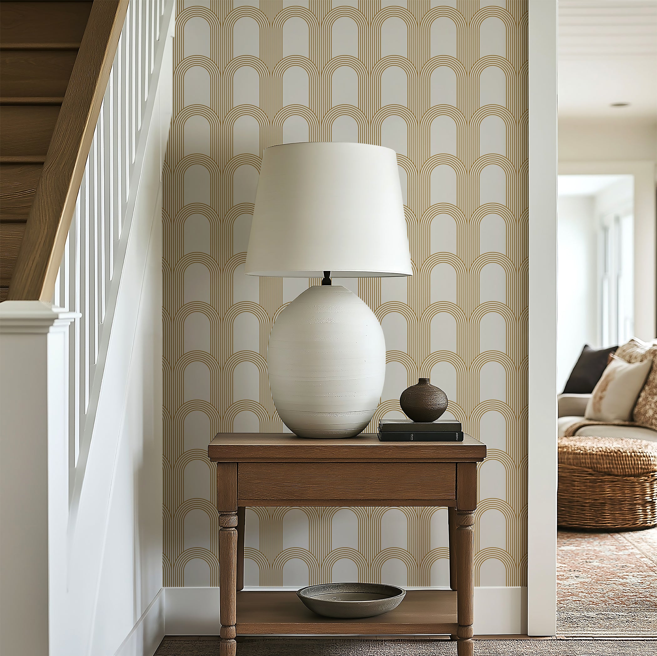 Add elegance and a touch of modern glamour to your walls with "Golden Archways." Inspired by the classic Art Deco movement, this wallpaper features a flowing pattern of arches rendered in rich gold tones against a stark white background. The design has a strong architectural quality that nods to vintage glamour while remaining sleek and contemporary. Perfect as a feature wall, in a foyer, or for creating a luxe powder room, the "Golden Archways" wallpaper introduces rhythm and dimension to your space without dominating it. Symmetrical and subtly reflective, the gold catches the light and adds visual interest, making this geometric wallpaper a dramatic yet versatile choice. High-quality and easy to apply, this wallpaper is designed to be a timeless addition to your interior design repertoire. It's the perfect choice for design enthusiasts in search of an Art Deco wallpaper that's bold and modern but with a nod to the elegance of classic Art Deco.