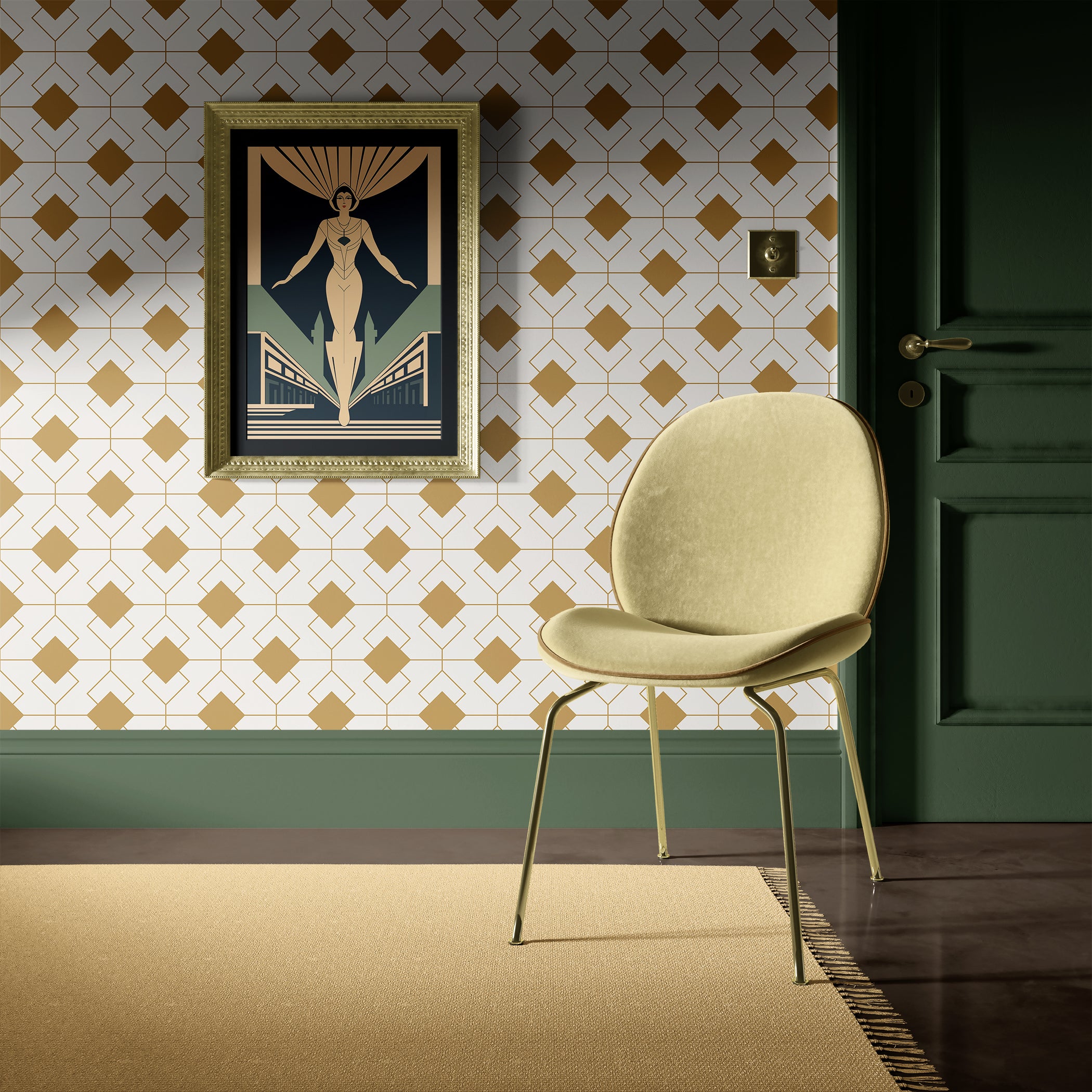 "Golden Ratio Grid" is a wallpaper that merges modern Art Deco design with timeless elegance. Featuring clean-cut gold diamonds and sharp-edged symmetry, this modern wallpaper turns walls into eye-catching architectural elements. This easy-care grid pattern works well with both modern and vintage-inspired spaces, adding order and sophistication to living rooms, offices or entryways. Whether you want to create a gallery wall-style backdrop or an upscale modern vibe, this Art Deco wallpaper pattern provides just the right touch of drama. Designed to transform your space, "Golden Ratio Grid" offers a design that's both trendy and timeless, rooted in style, structure, and sophistication.