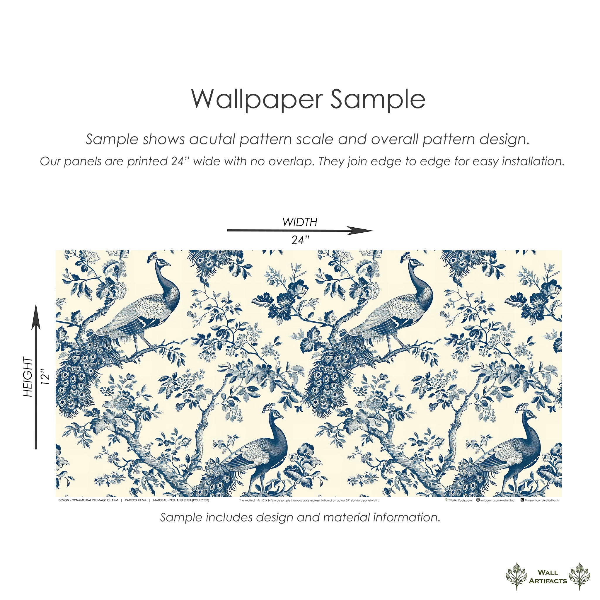 Our panels are 24” (2 feet) wide. Unlike most wallpaper rolls where there is approximately 1” of overlap, our panels are printed to the edge, making it easier for self-installation.