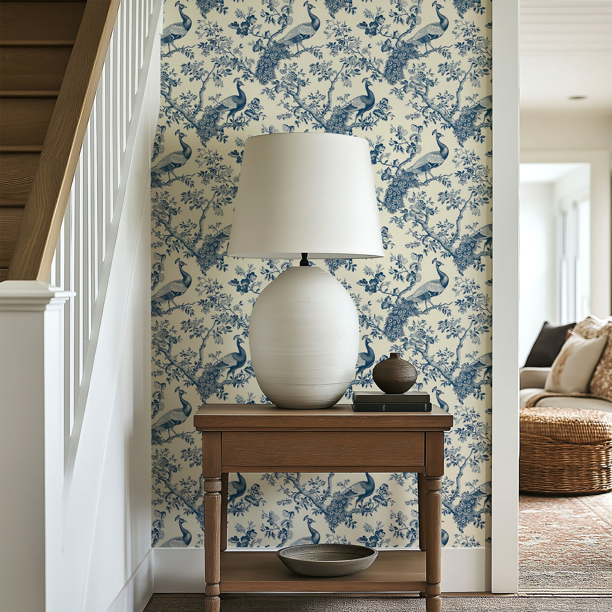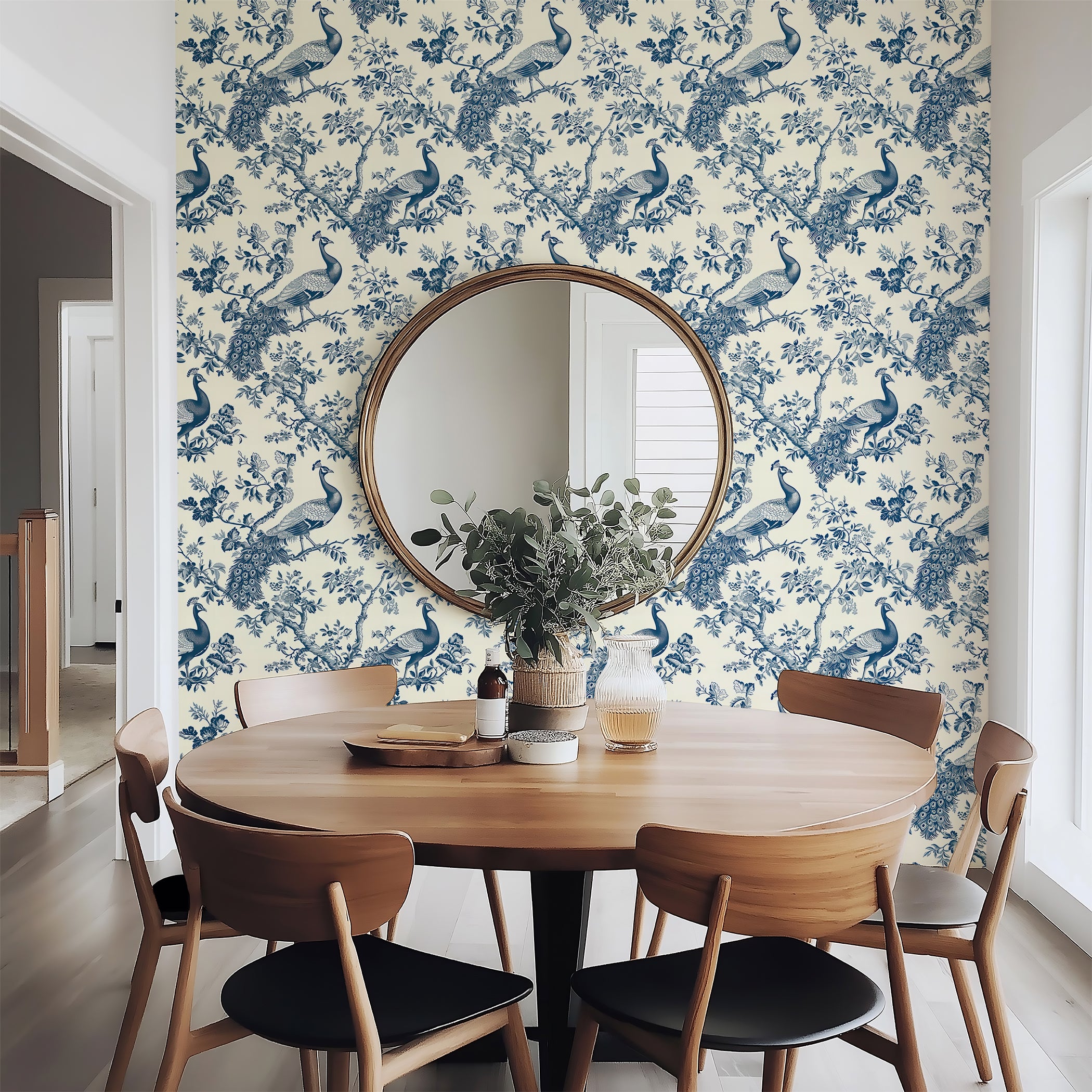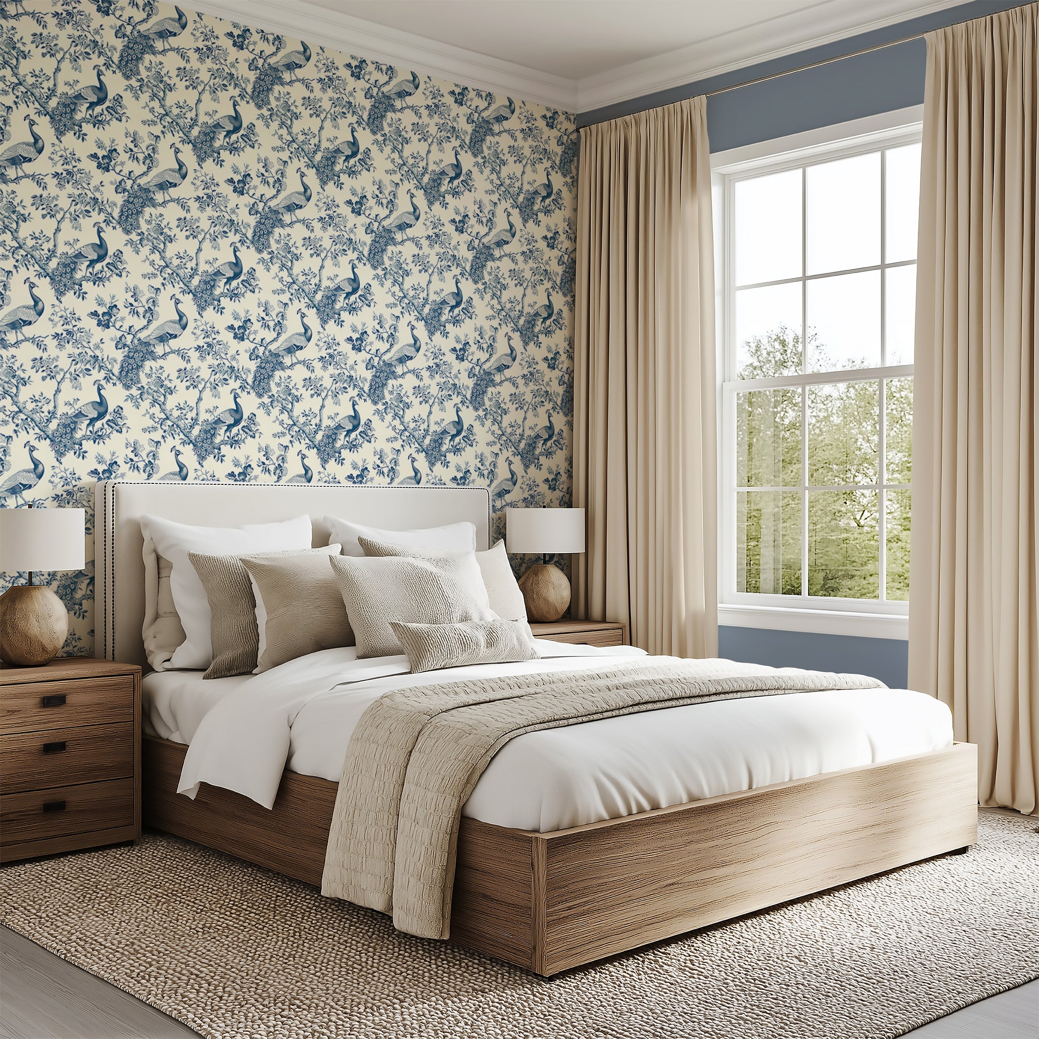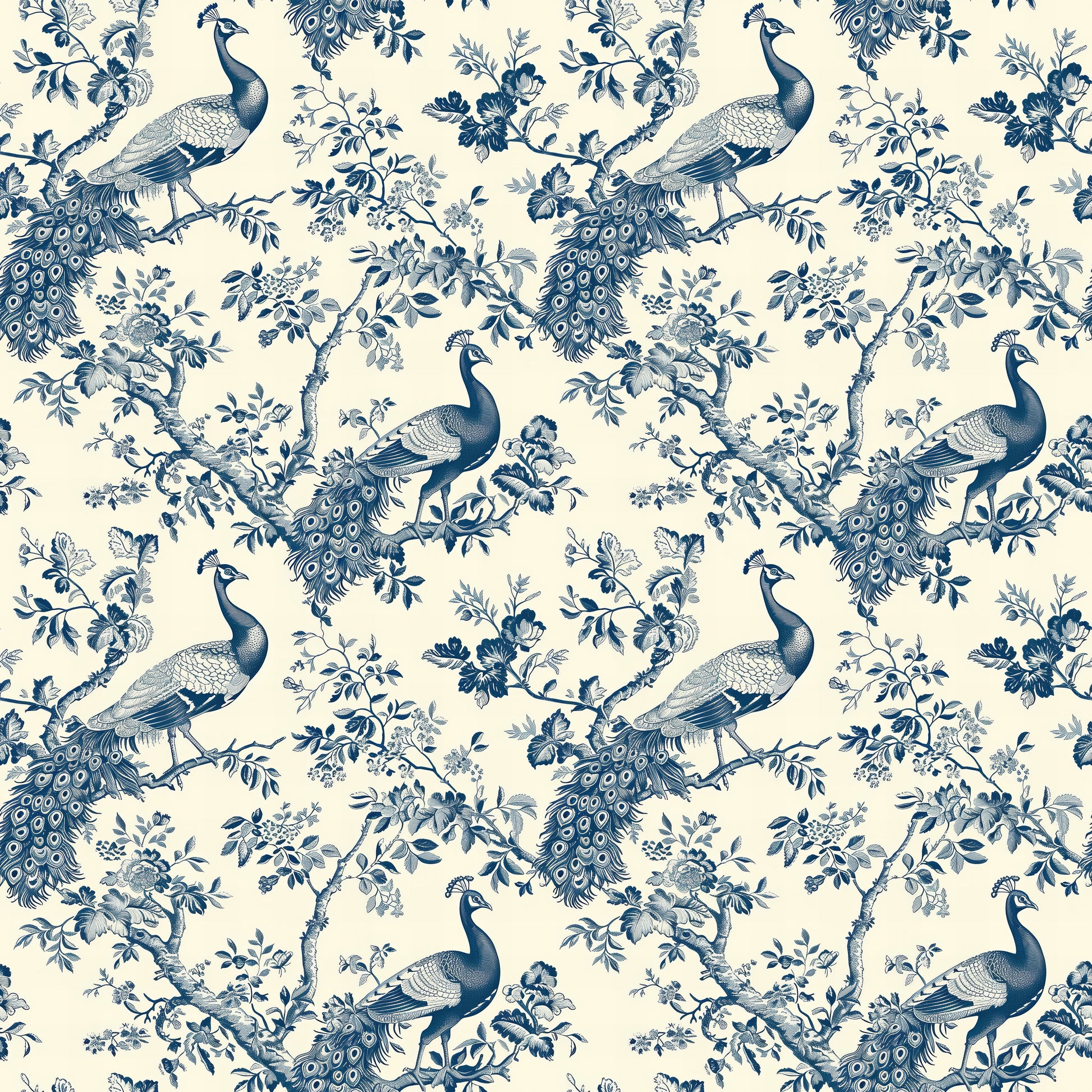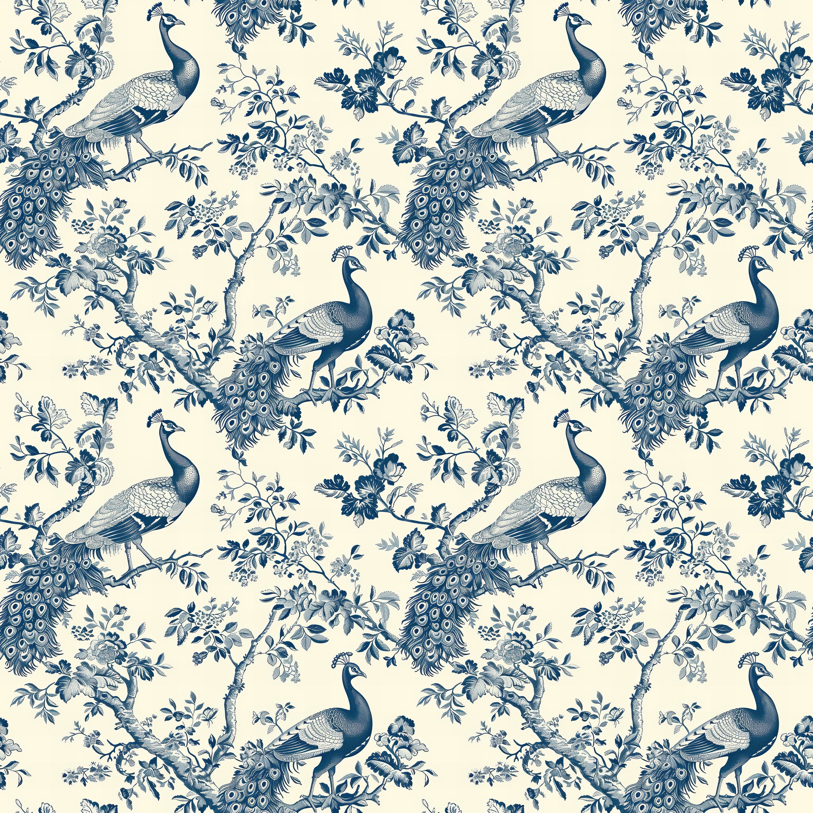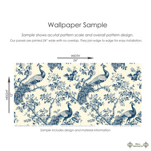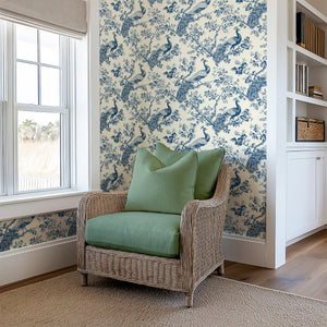 Elevate your space with "Ornamental Plumage Charm", a refined French toile wallpaper that captures the elegance of nature through detailed illustrations of peacocks among blooming branches. The soft blue palette and intricate linework create a timeless look ideal for formal dining rooms, cozy reading nooks, or sophisticated entryways. This wallpaper blends classic toile aesthetics with nature-inspired grace, offering a perfect balance of traditional charm and decorative appeal. Ideal for shoppers seeking bird wallpaper, botanical motifs, or elegant statement walls, this pattern brings serene beauty and heirloom quality to any home interior. A graceful choice for design-forward decorators.