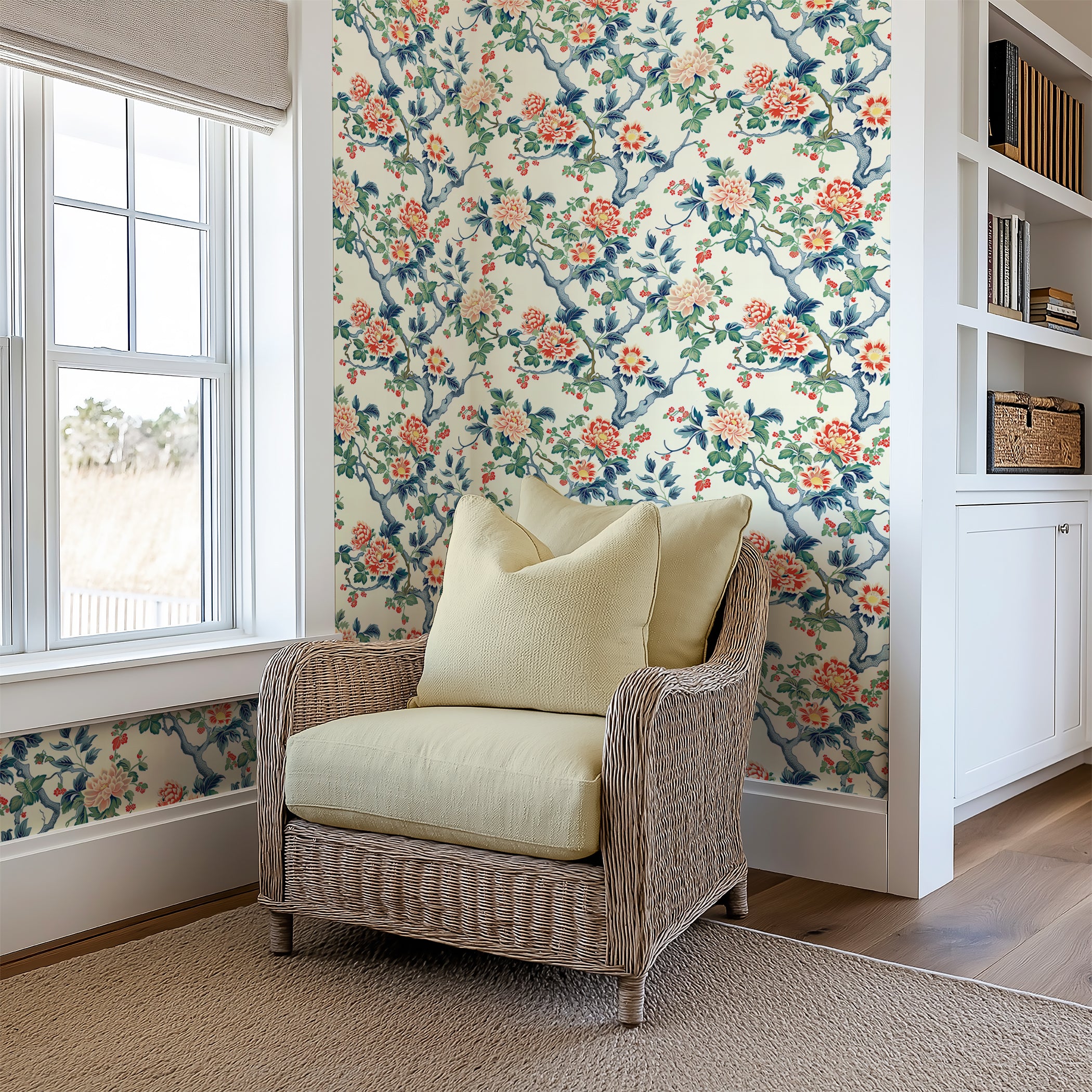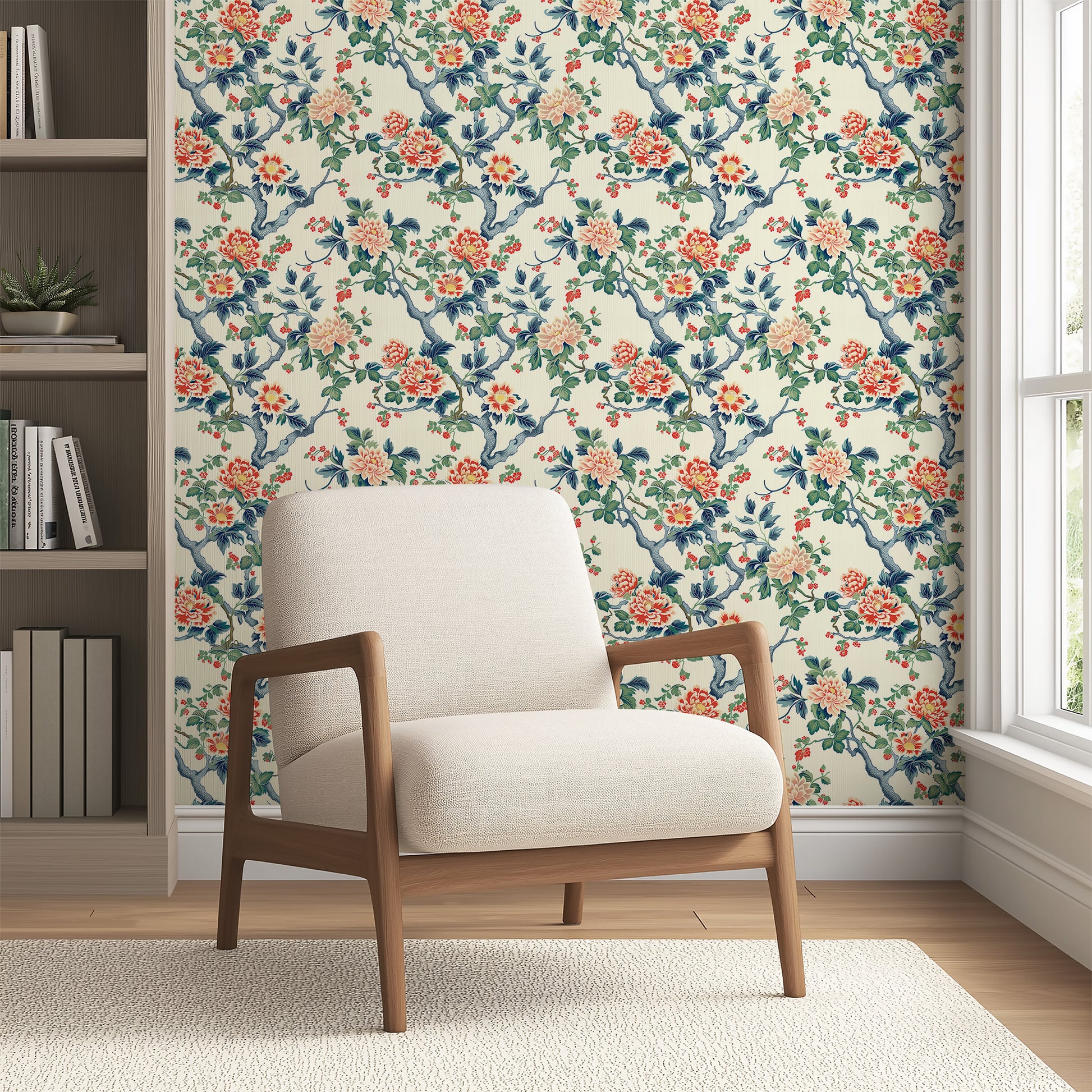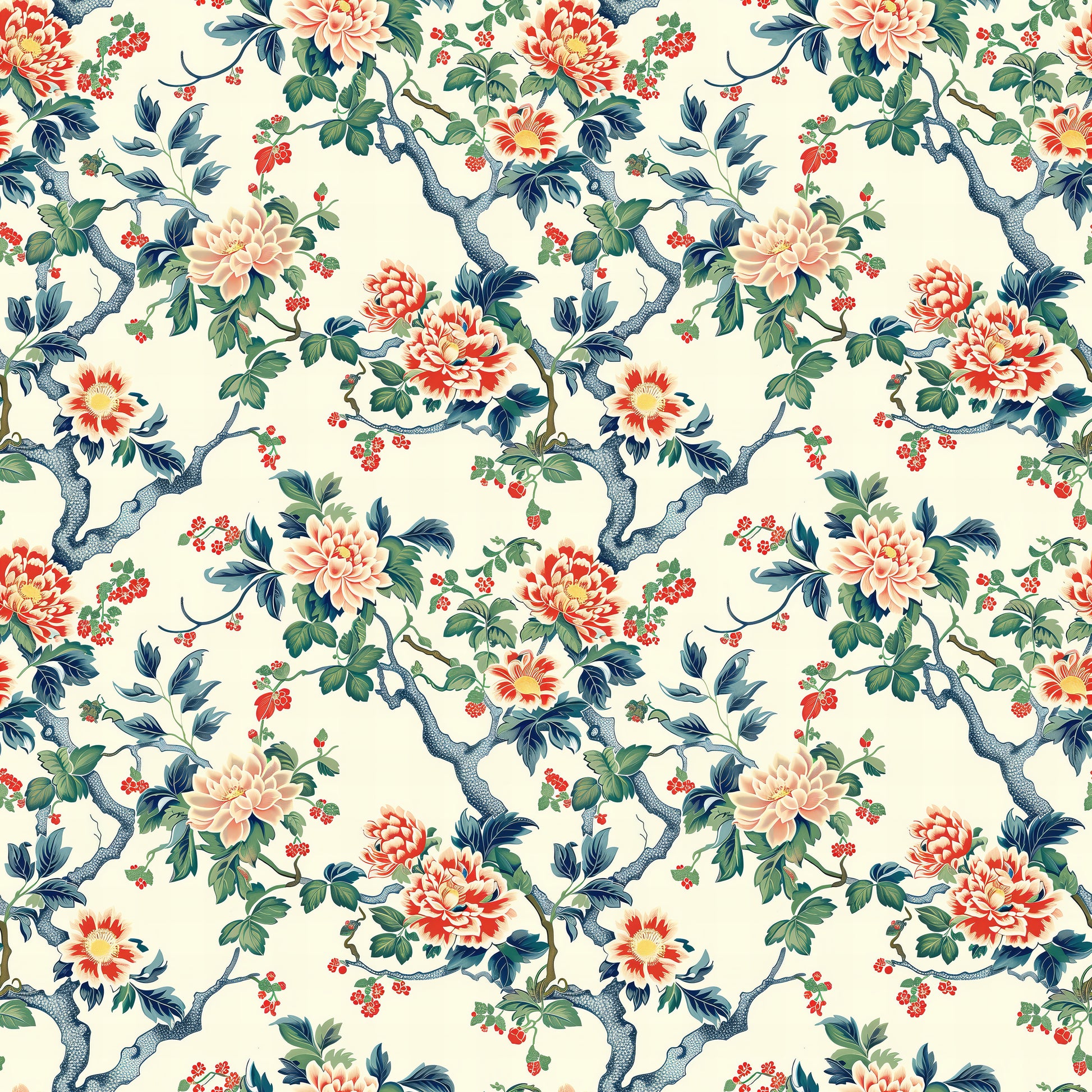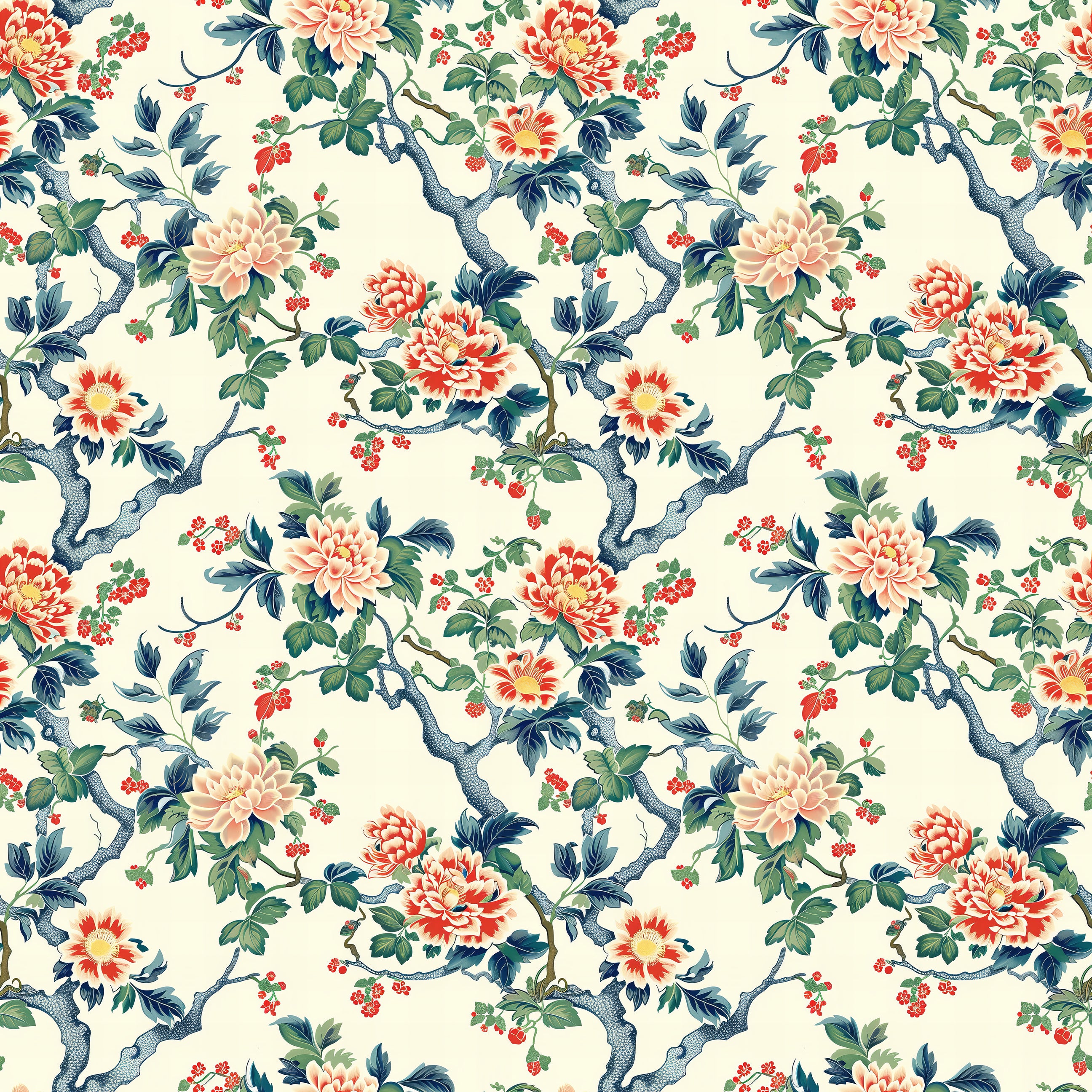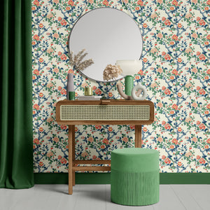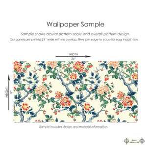 Elevate your décor with "Peony Pavilion," a floral wallpaper design inspired by vintage botanical illustrations. Soft peach and bright coral peonies gracefully unfurl against the backdrop of swirling branches and lush, dark green leaves, creating a stunning celebration of nature's beauty. Perfect for dining rooms, bedrooms, or a feature wall, this floral wallpaper design infuses your space with warmth, romance, and timeless elegance. Whether you're creating a nostalgic, vintage-inspired interior or adding natural sophistication to a modern home, this wallpaper brings a sophisticated and high-impact touch without overpowering your room. A must-have for anyone in search of luxury floral wallpaper or classic, artistic wall art.