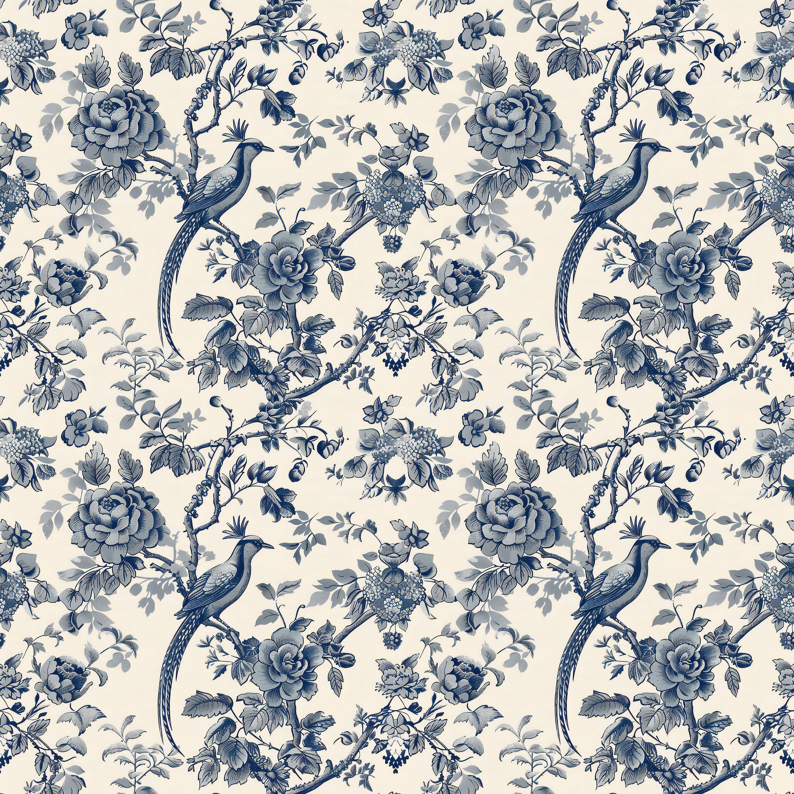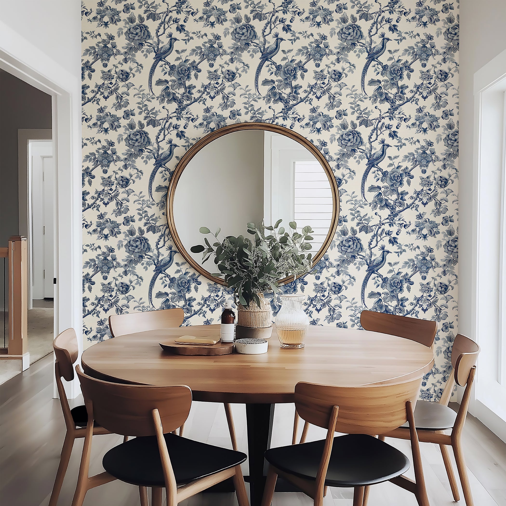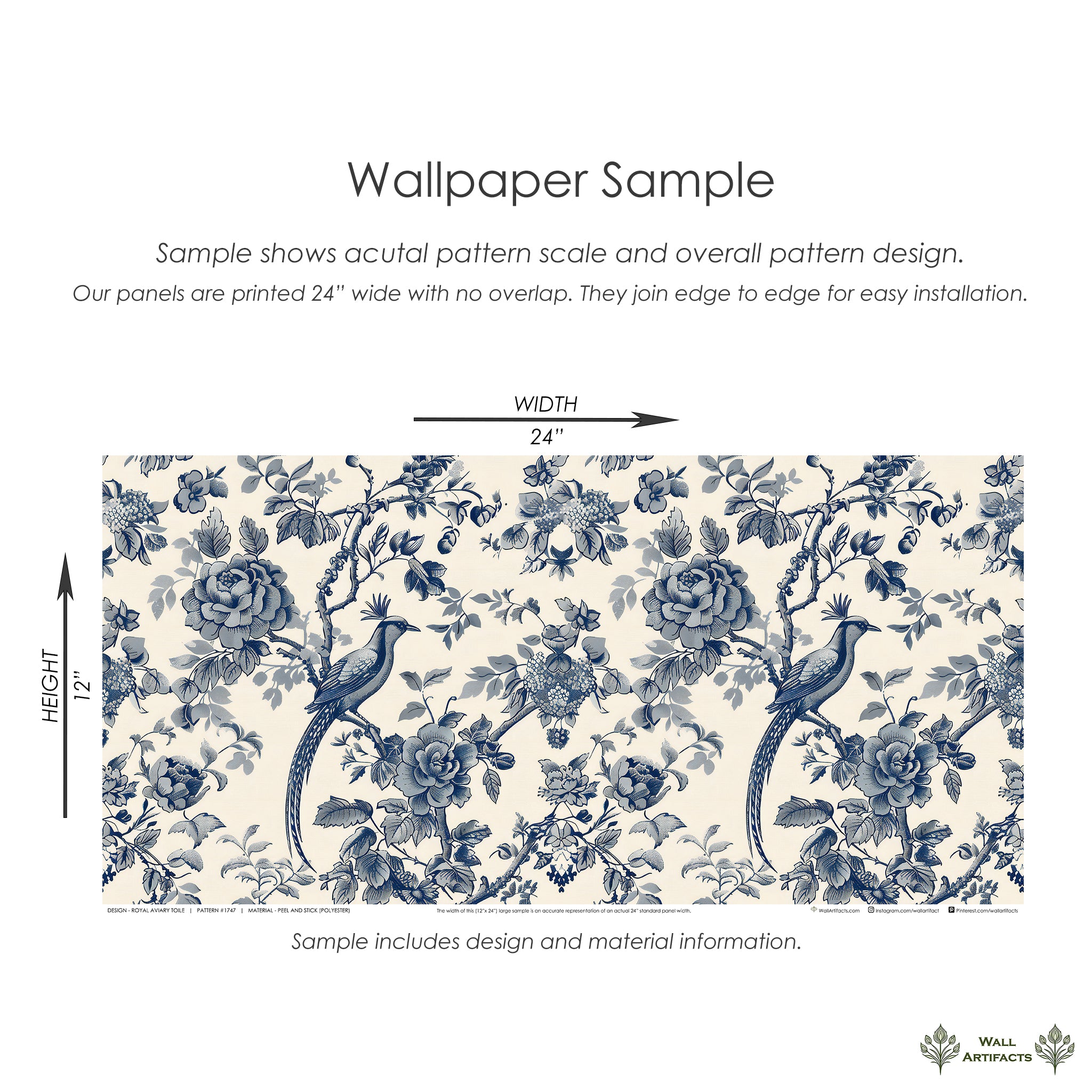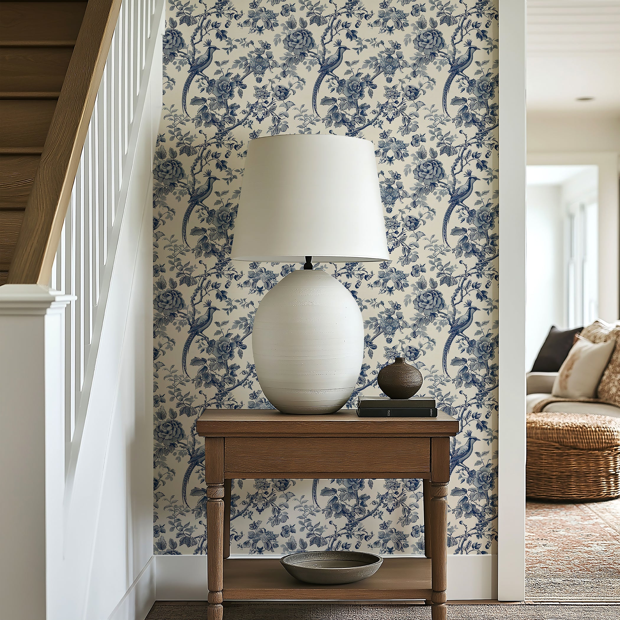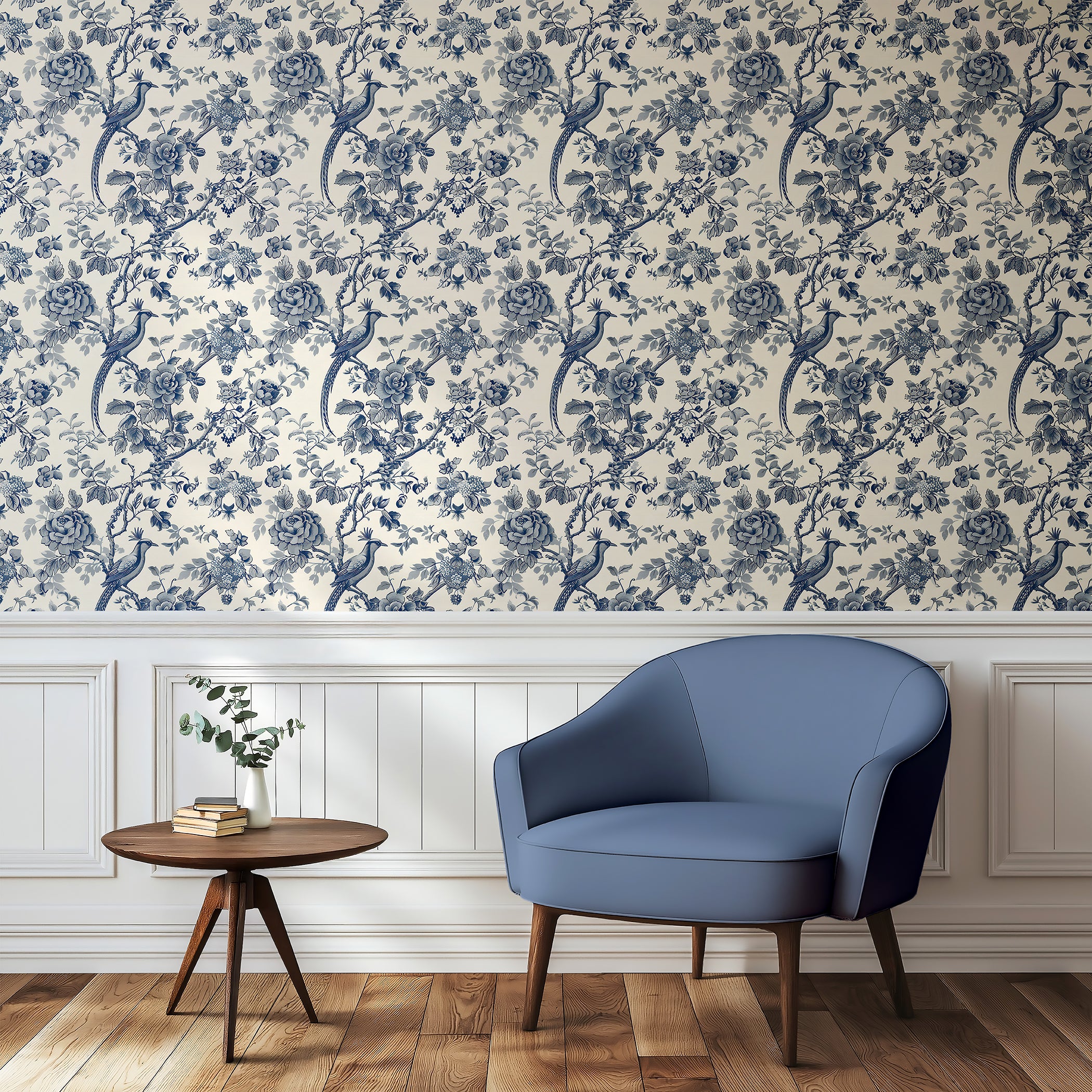 Wall Artifacts' "Royal Aviary Toile" bird wallpaper brings the charm of antique French toile designs to your space with its delicate blue and white palette. Featuring an intricate pattern of elegantly feathered birds nestled among roses and vine, this wallpaper offers a timeless sophistication ideal for traditional living rooms, powder rooms, and entryways. Perfect for those creating a cottagecore look or aiming to elevate a formal setting, the subtle symmetry and classic bird theme in this French toile wallpaper make it an excellent choice for any room seeking a touch of elegance. Made from high-quality, removable wallpaper materials, the "Royal Aviary Toile" is a home decorator's dream, providing a straightforward application process and a visually stunning result that will add beauty and character to your home for years to come.