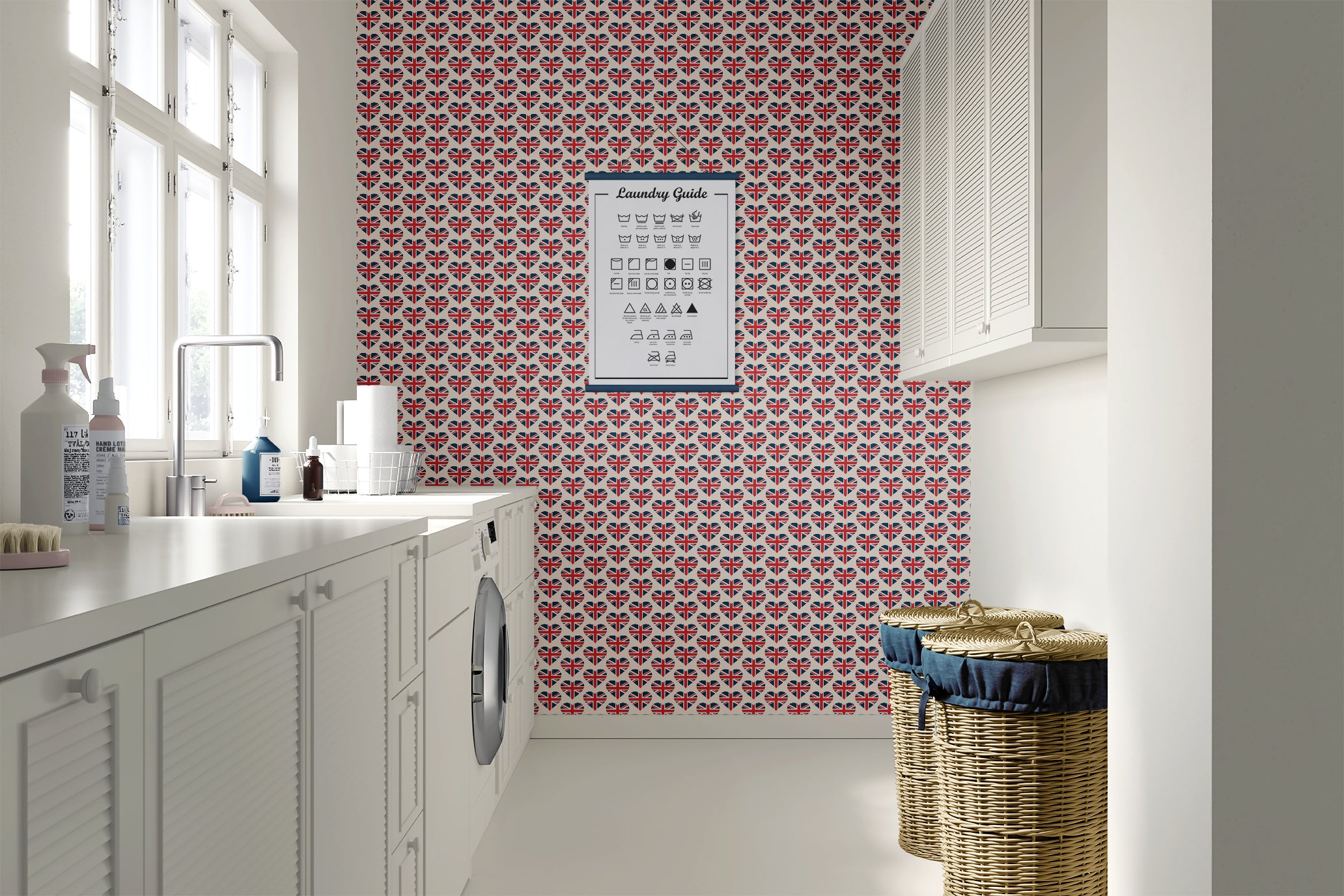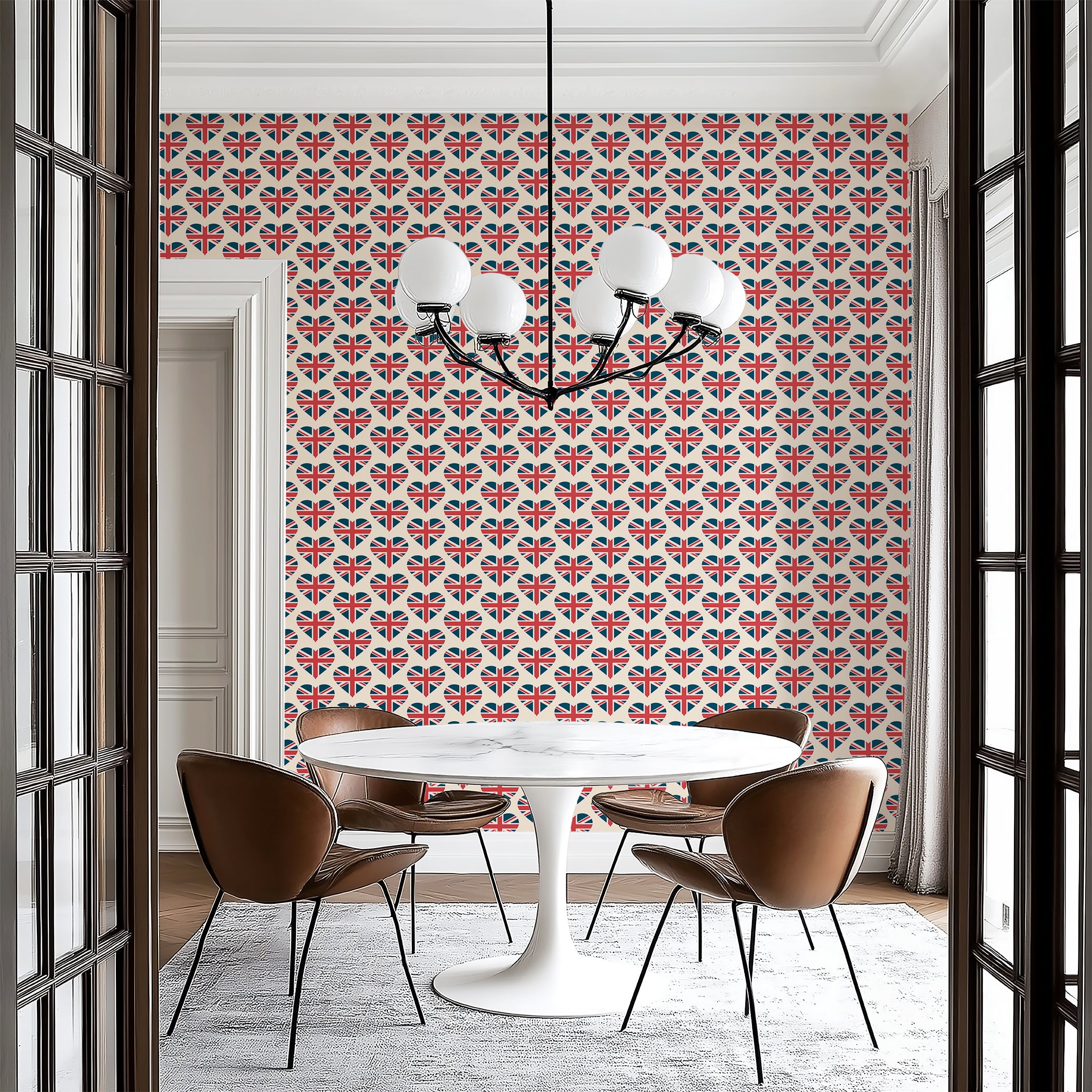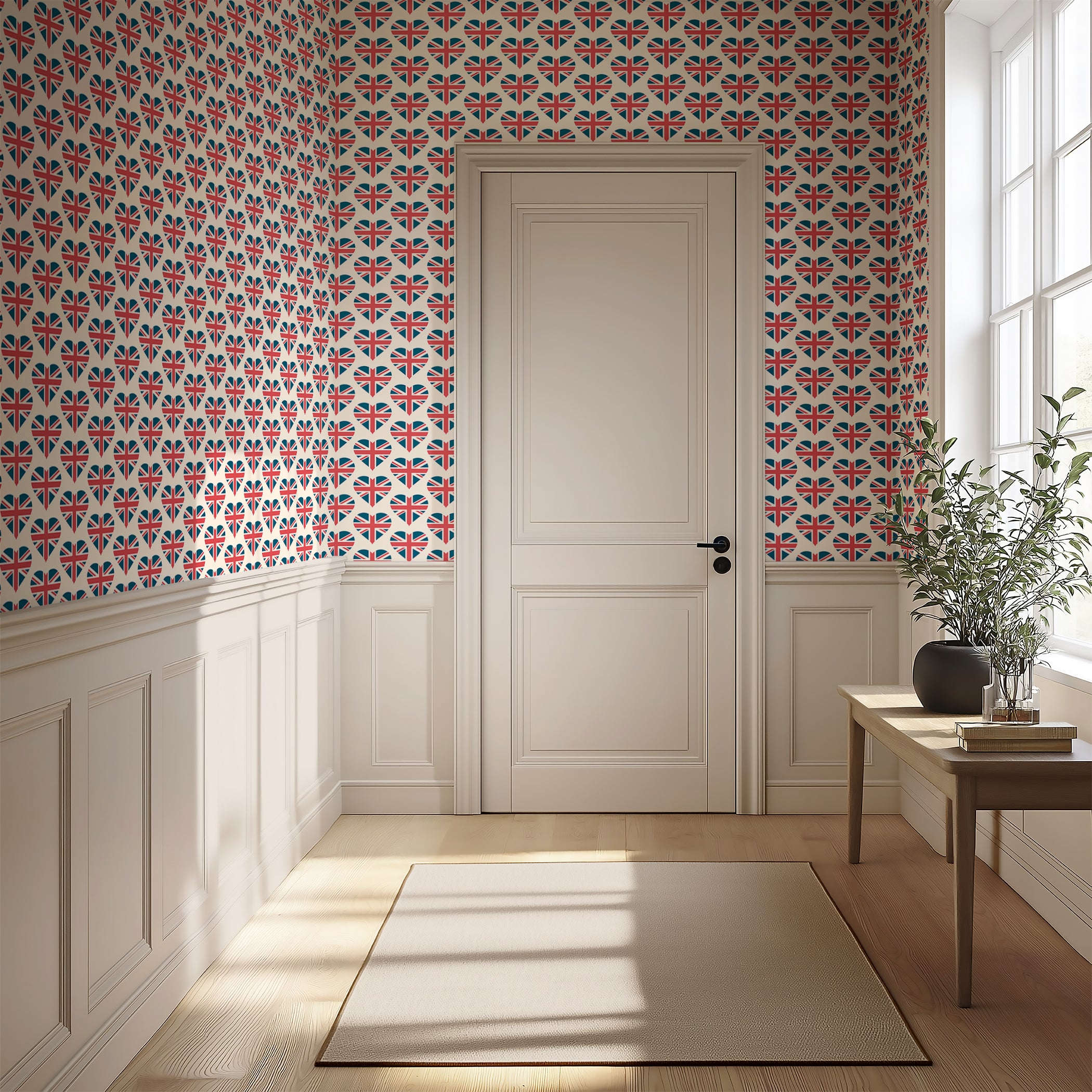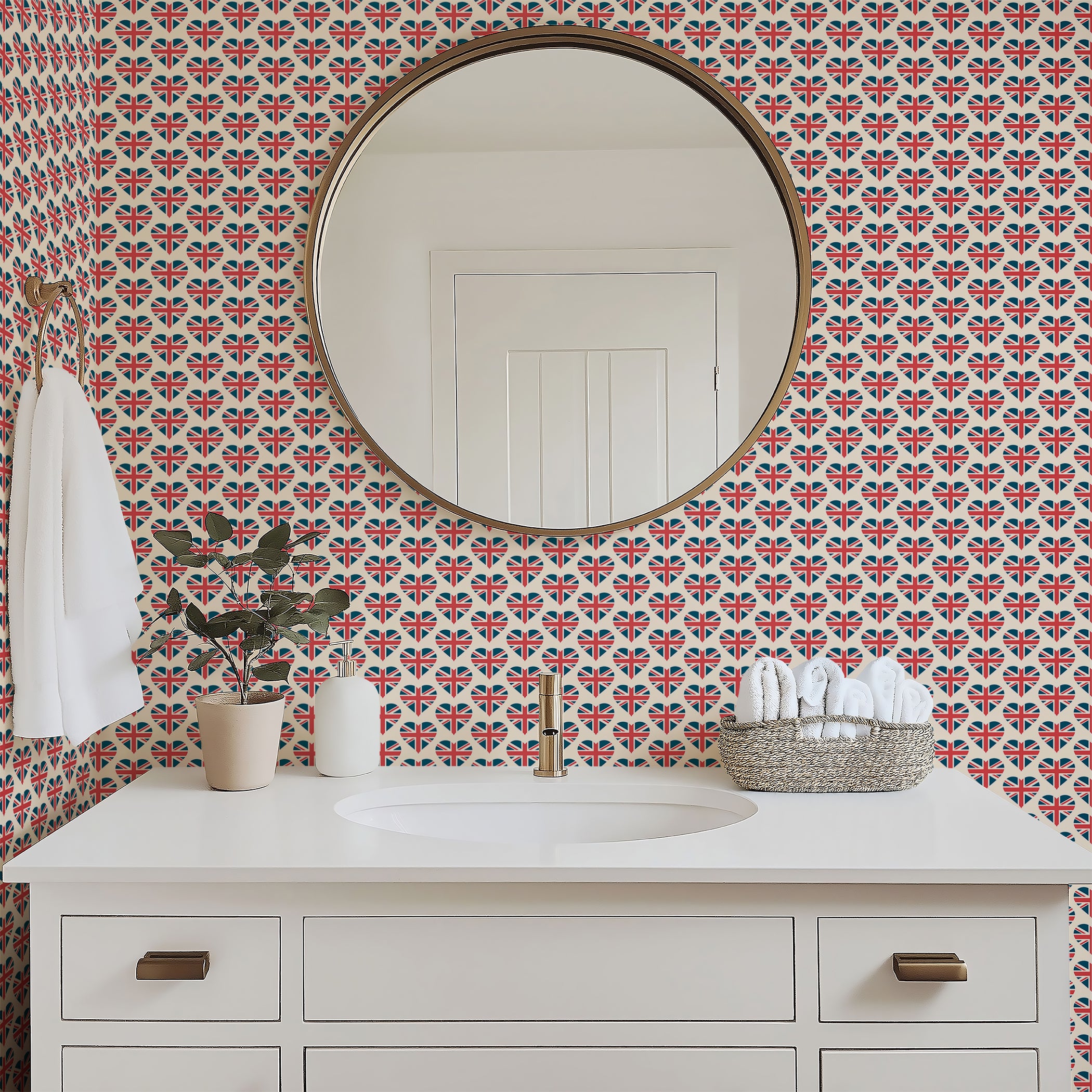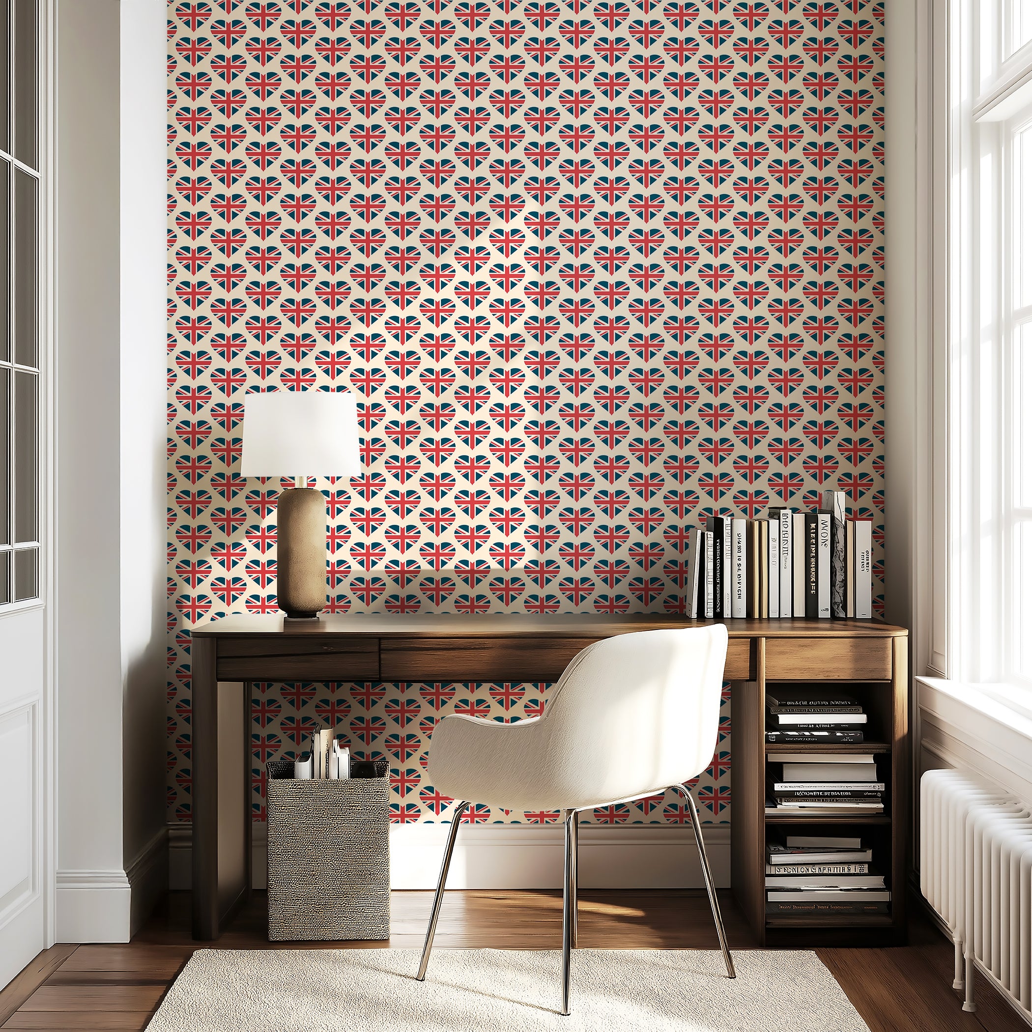 British but with a twist of the modern - grab your flag and check out "Royal Love Pattern" wallpaper. The repeating pattern of heart shaped Union Jacks is sure to be a conversation starter and is both a very UK based icon as well as a fresh and playful update on a classic graphic design. For travel themed décor, statement accent walls, or for those who want to add a global vibe to a kids room this bold and fun design has worldwide appeal. For the Anglophile, the seasoned world traveler or anyone who loves a loud graphic print this travel wallpaper is sure to make a statement. Made with an easy apply peel and stick back and quality fade resistant materials so you know it's the perfect pick for your home or office in need of some color, culture and personality. Available exclusively from Wall Artifacts.
