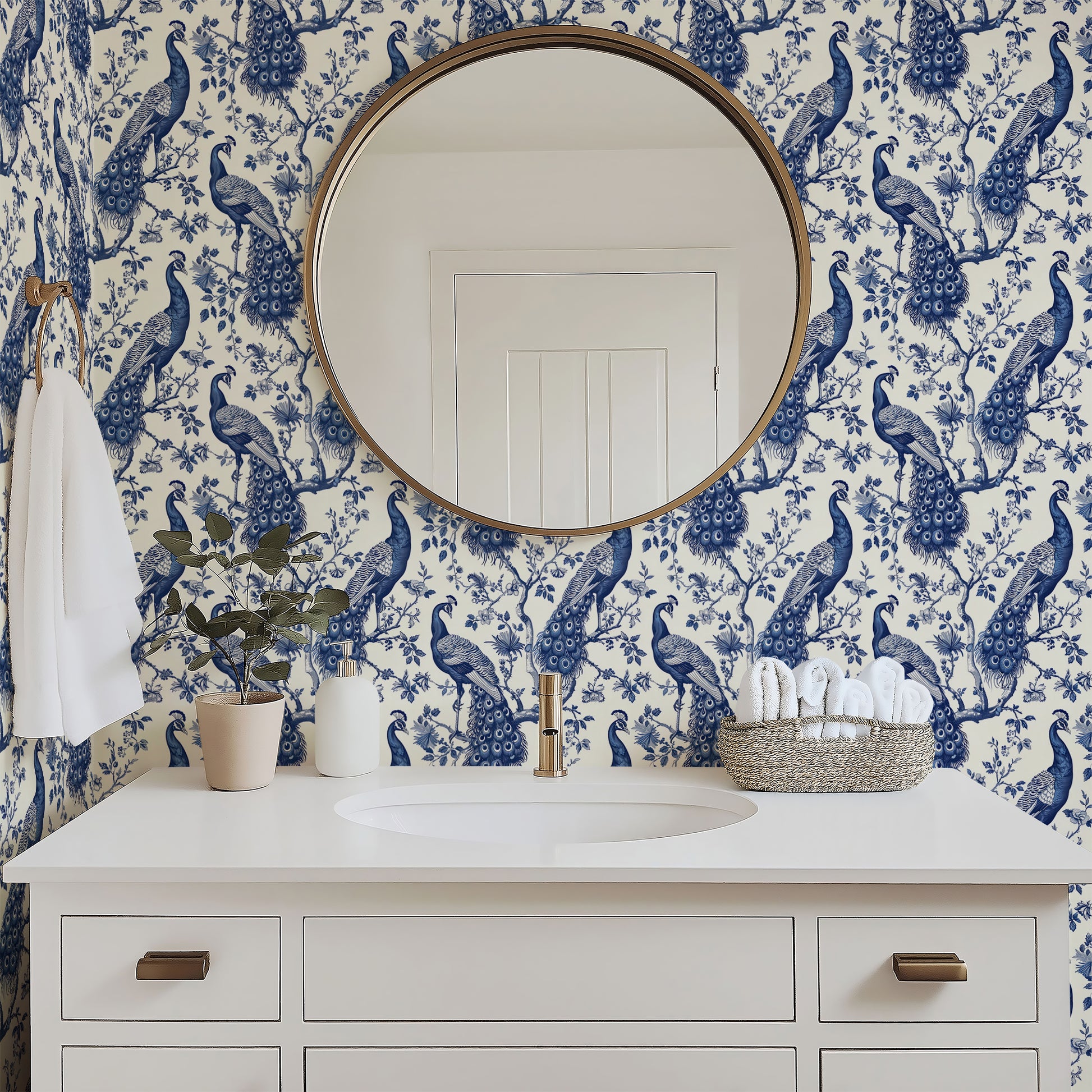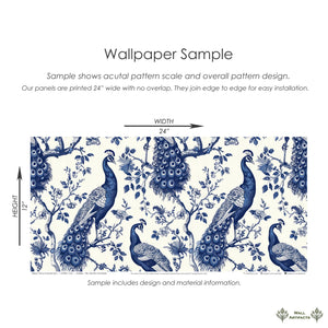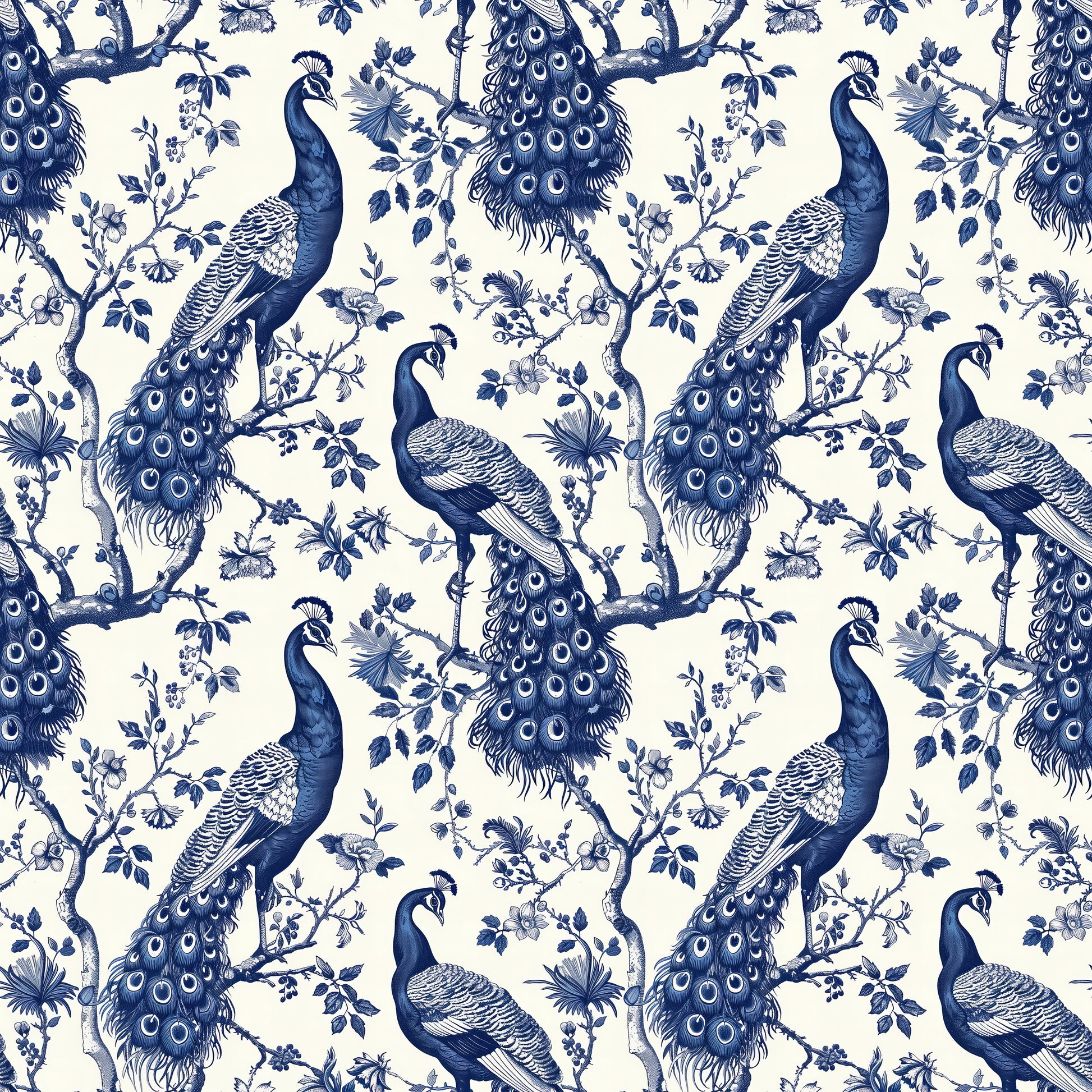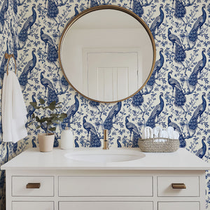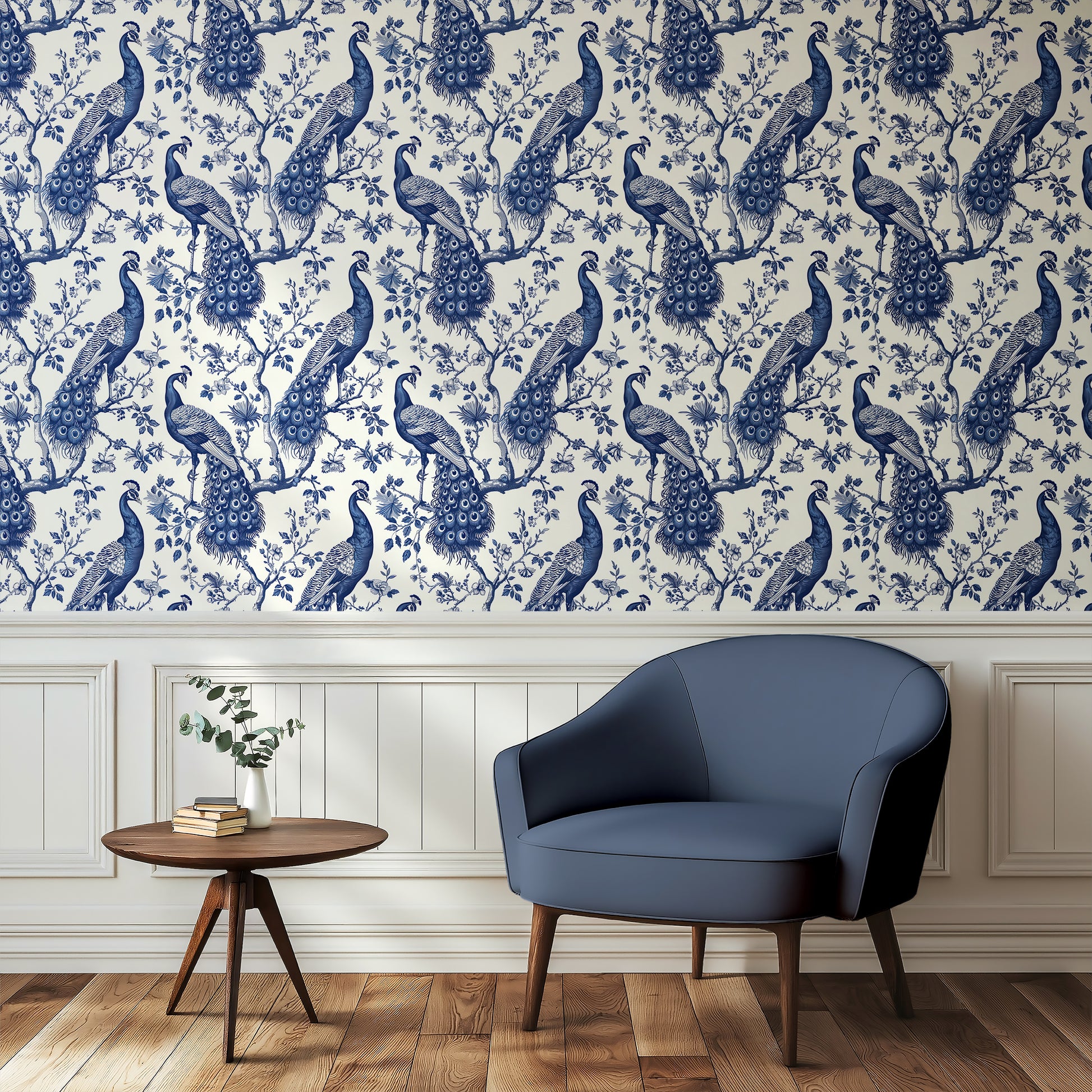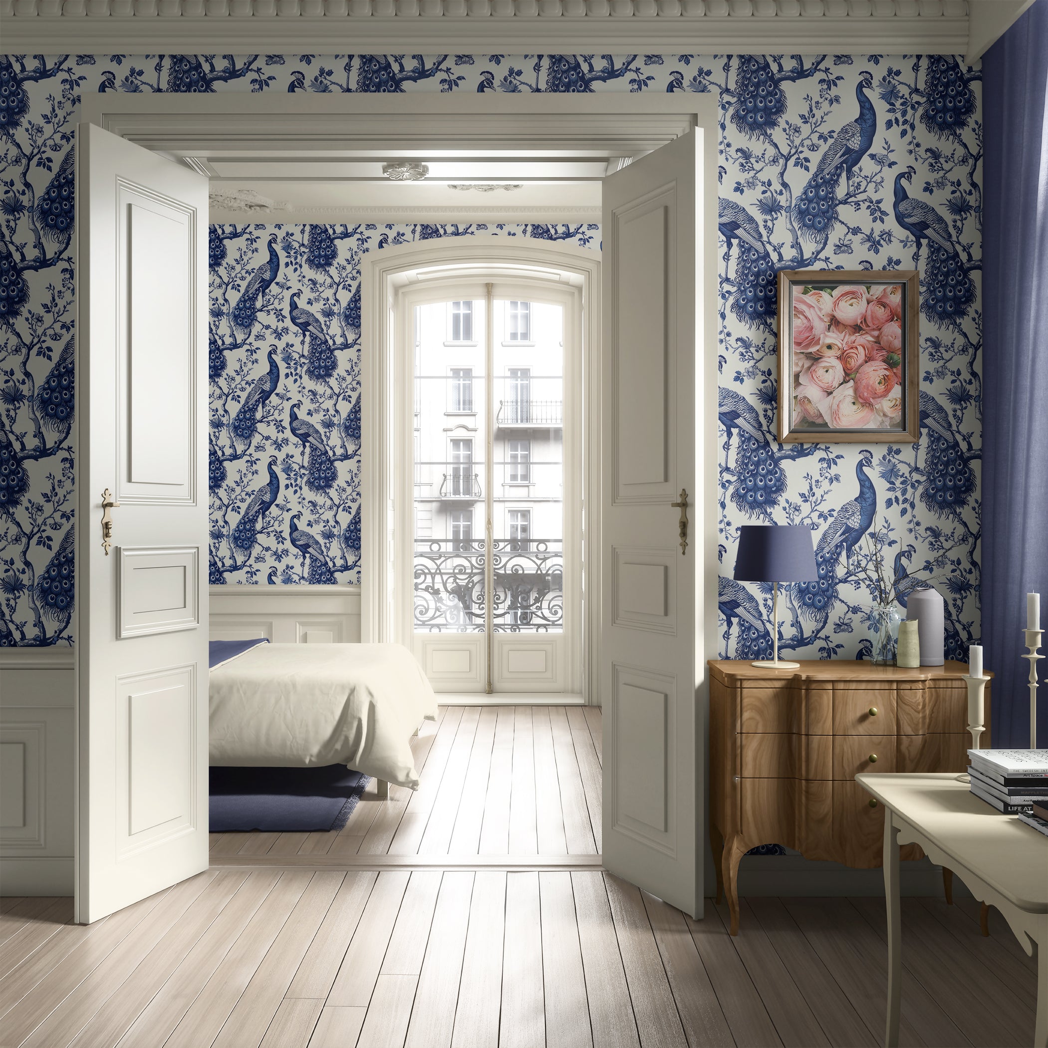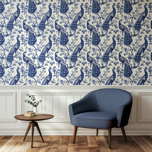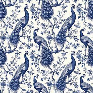 Add a touch of timeless elegance to your walls with "Royal Plumage Toile," a luxurious French toile wallpaper featuring exquisitely illustrated peacocks at rest amidst delicate flowering branches. Rendered in a deep shade of blue, this classic toile design showcases the timeless beauty of the natural world with a rich and opulent Old World flair. Perfect for hallways, powder rooms, and feature walls, this intricate wallpaper with its delicate details and graceful repetition adds a touch of sophistication to any traditional or eclectic interior. This wallpaper will enchant anyone who loves ornamental birds, vintage glamour, and high-end wallcoverings. Make a statement with a bird wallpaper design that's as striking as it is stunning.