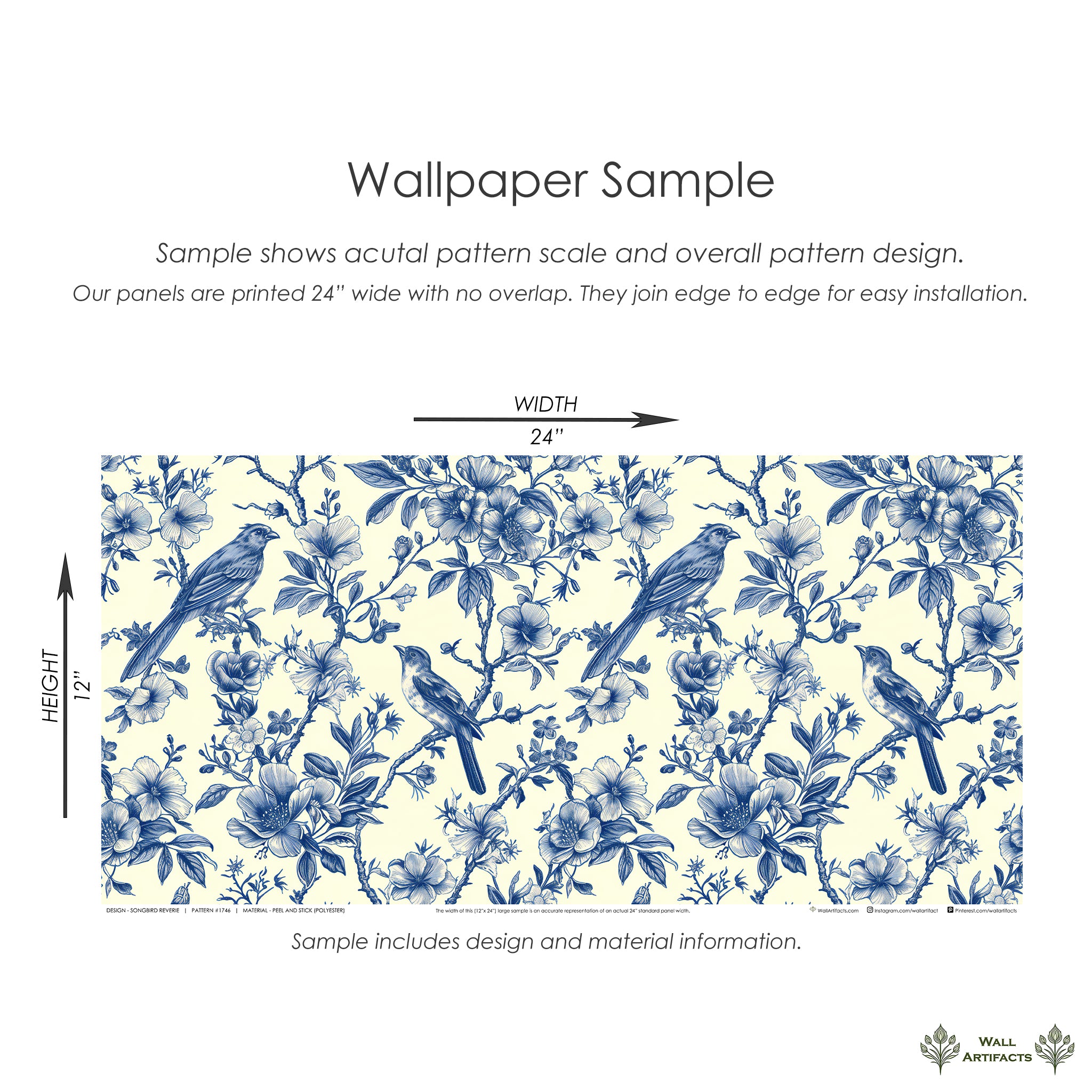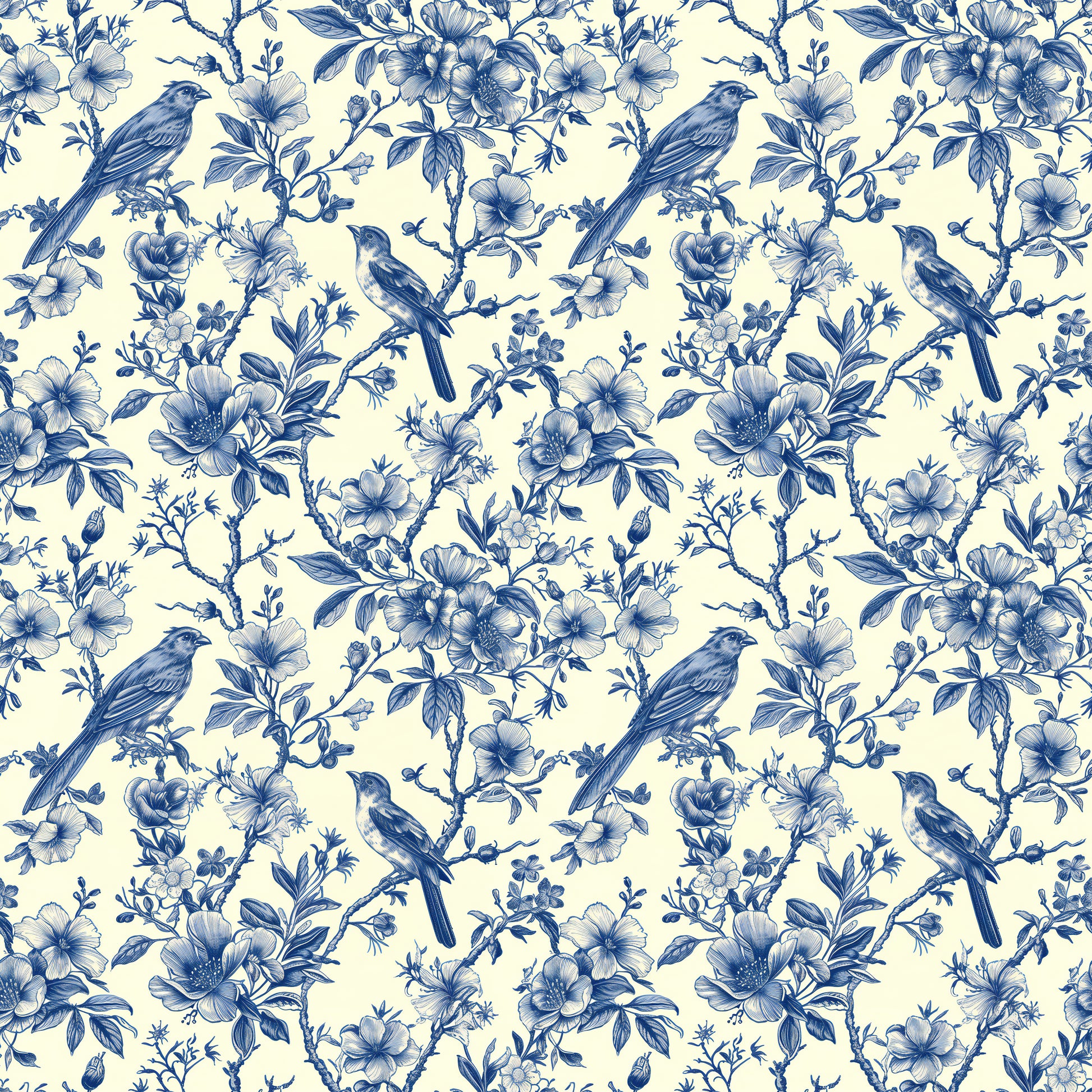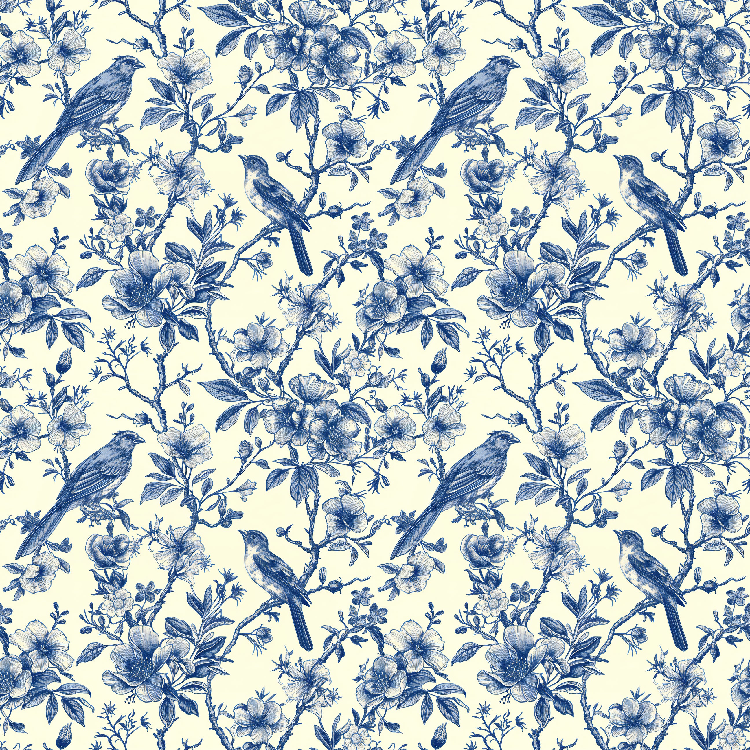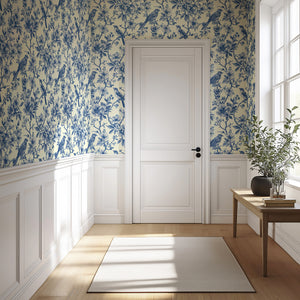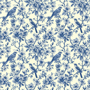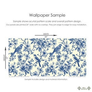 Introducing "Songbird Reverie", a wallpaper from Wall Artifacts. This delicate blue toile wallpaper features intricately drawn birds perched on thick, verdant branches surrounded by delicate, flowering leaves, a timeless design that calls to mind elegant, historical botanical prints. With its vintage-inspired charm, "Songbird Reverie" is perfect for creating a traditional, cottagecore or French-inspired design scheme, making it a great choice for any space that you're looking to infuse with nature and birds. Use this bird and nature wallpaper to create a statement wall or for full-room coverage in bedrooms, dining rooms and more, this elegant and easy-to-install French toile wallpaper will bring fresh, classic style to your home. Printed on our premium, removable wallpaper, this elegant wallpaper is also a great option for renters and home decorators looking for a chic, effortless wallpaper alternative.