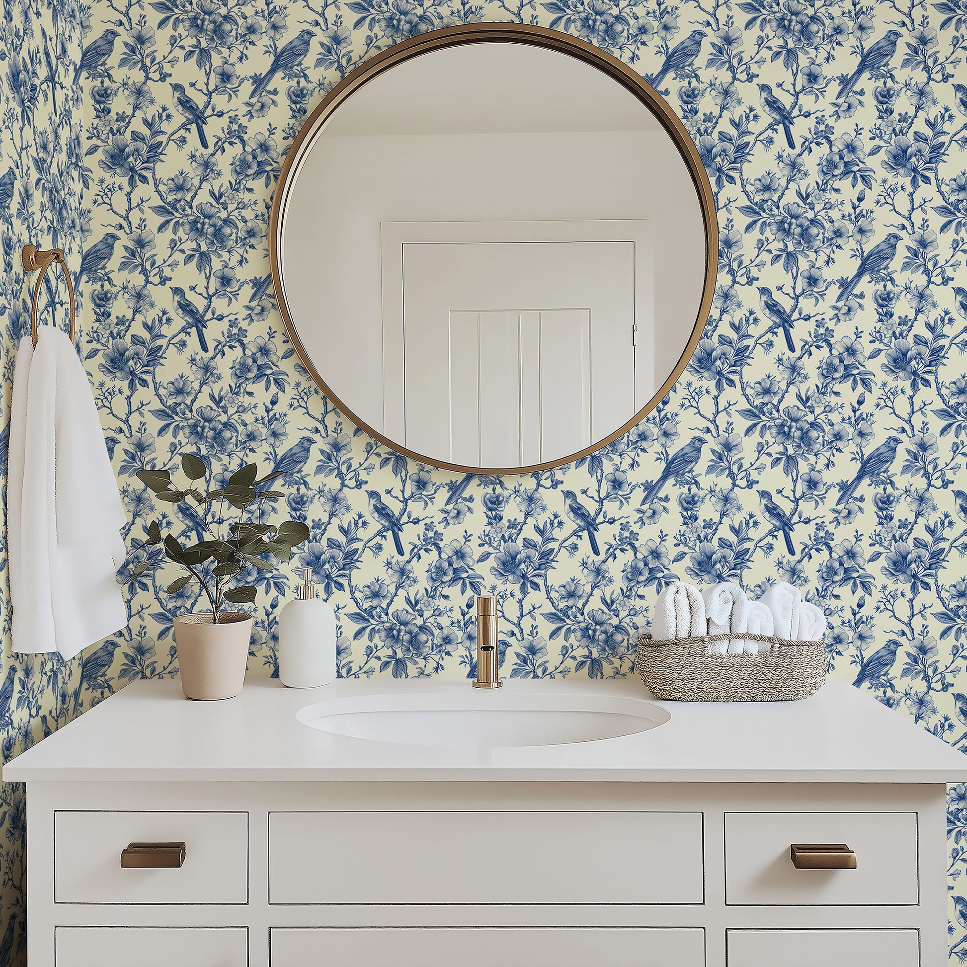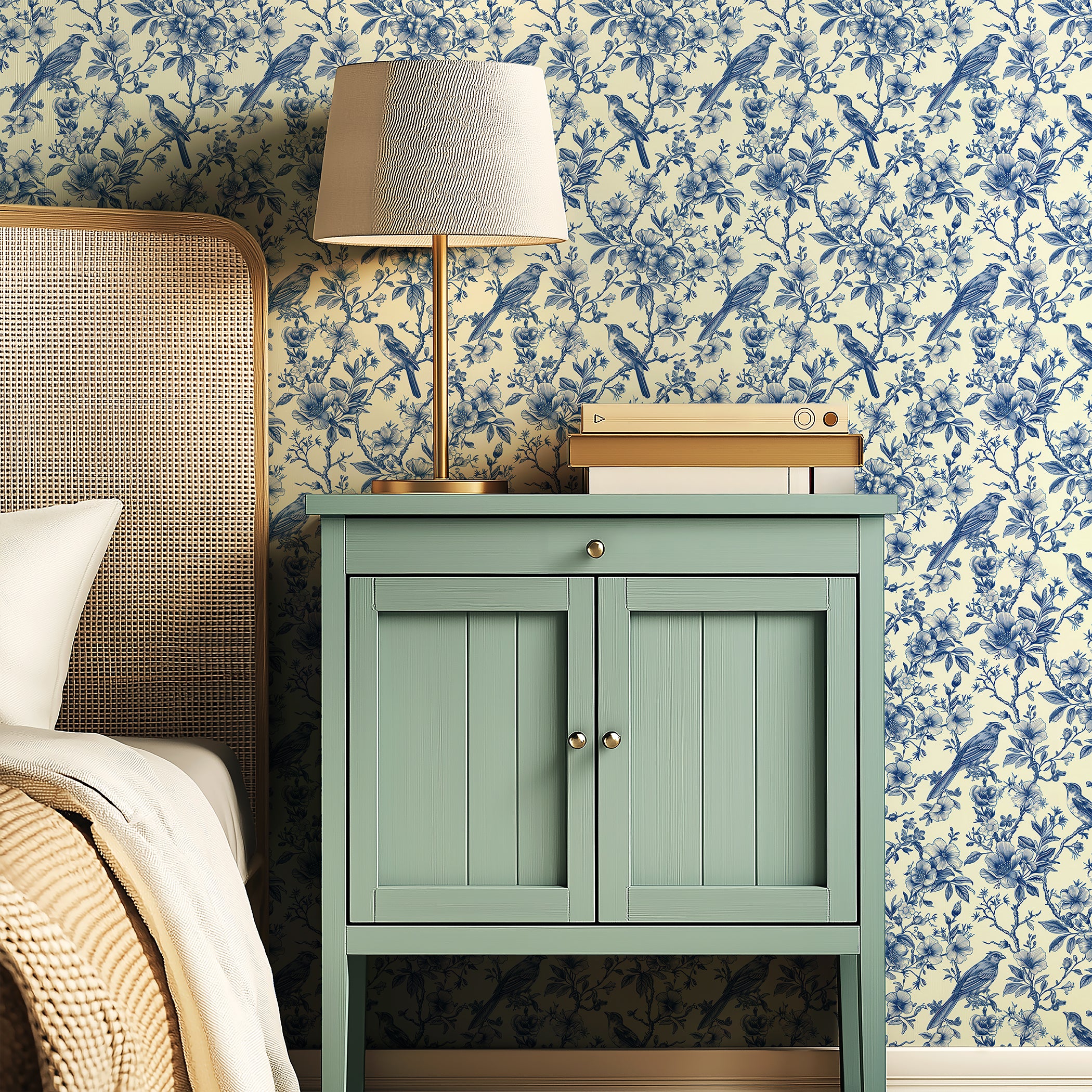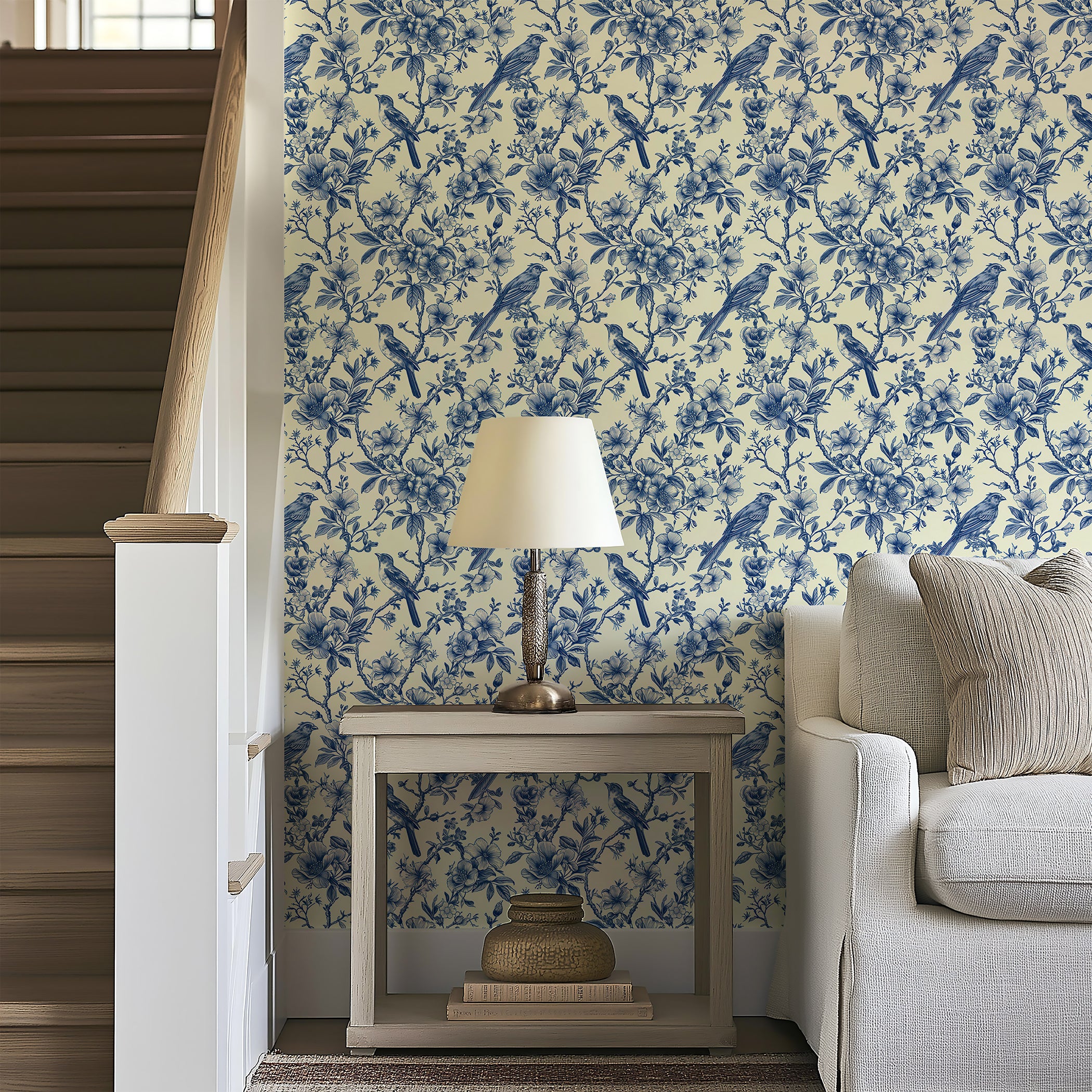 Introducing "Songbird Reverie", a wallpaper from Wall Artifacts. This delicate blue toile wallpaper features intricately drawn birds perched on thick, verdant branches surrounded by delicate, flowering leaves, a timeless design that calls to mind elegant, historical botanical prints. With its vintage-inspired charm, "Songbird Reverie" is perfect for creating a traditional, cottagecore or French-inspired design scheme, making it a great choice for any space that you're looking to infuse with nature and birds. Use this bird and nature wallpaper to create a statement wall or for full-room coverage in bedrooms, dining rooms and more, this elegant and easy-to-install French toile wallpaper will bring fresh, classic style to your home. Printed on our premium, removable wallpaper, this elegant wallpaper is also a great option for renters and home decorators looking for a chic, effortless wallpaper alternative.