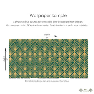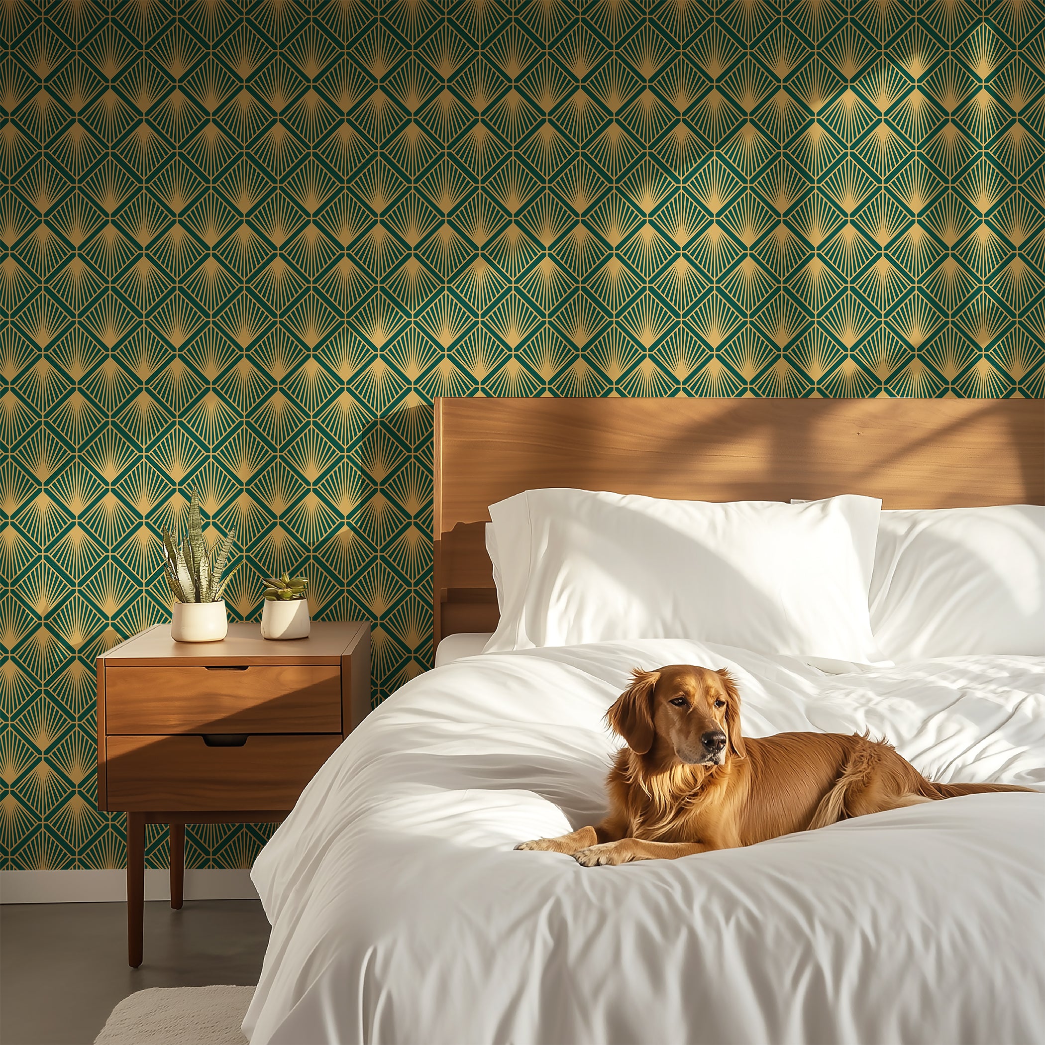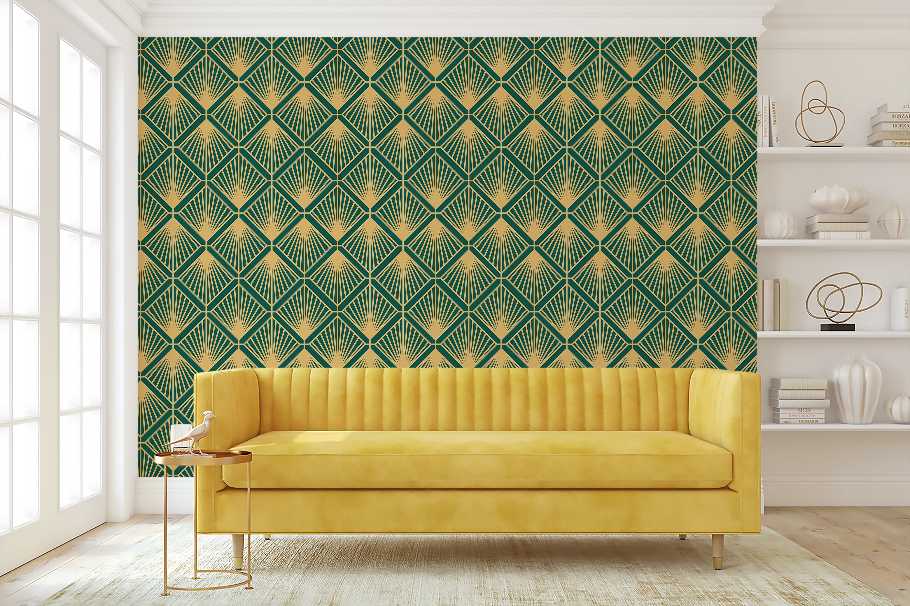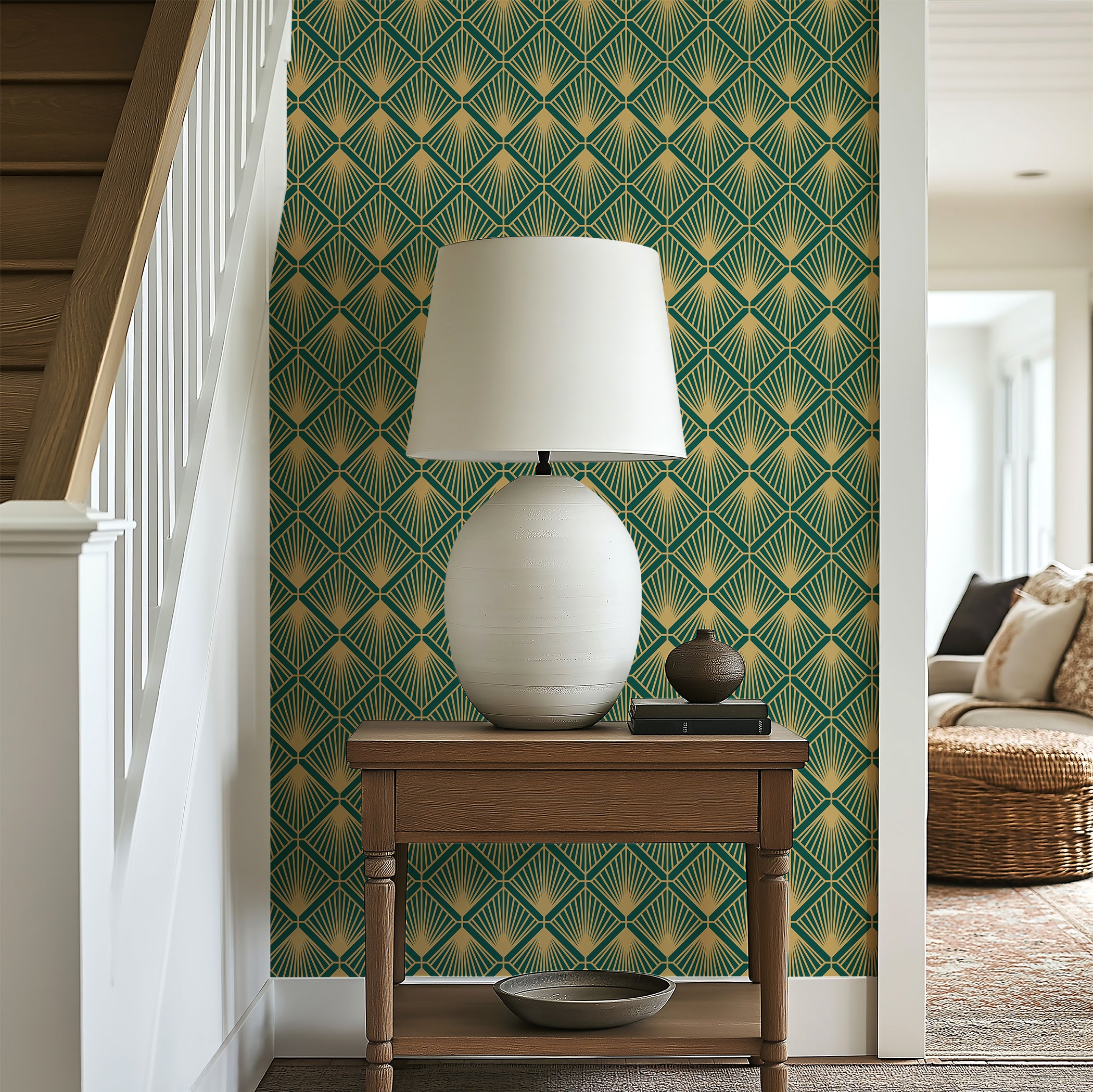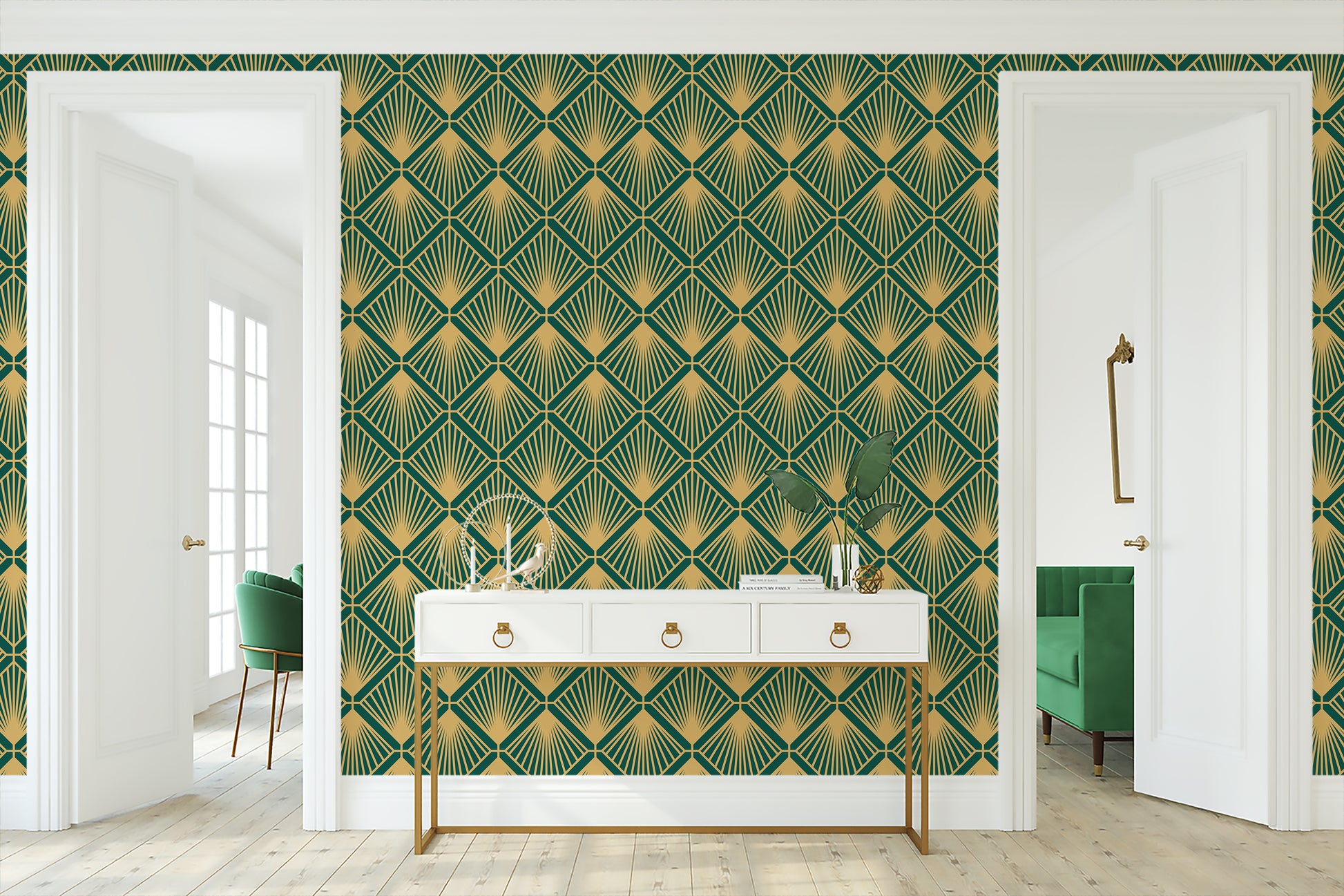 Introducing "Vintage Luxe Rays", an exquisite Art Deco wallpaper design that combines vintage glamour with a modern twist. Radiant fan bursts in rich golds set against a deep emerald background, this pattern is reminiscent of the Roaring Twenties with a fresh and stylish edge. Perfect for creating a feature wall, dressing a dining room, or adding a touch of boutique elegance to an entryway, Vintage Luxe Rays is both glamorous and contemporary without being overpowering. Designed for easy installation and enduring elegance, Vintage Luxe Rays is the ideal choice for those who desire a luxurious geometric wallpaper that marries sharp symmetrical lines with inviting decorative elements. Bold, sophisticated, and memorable.